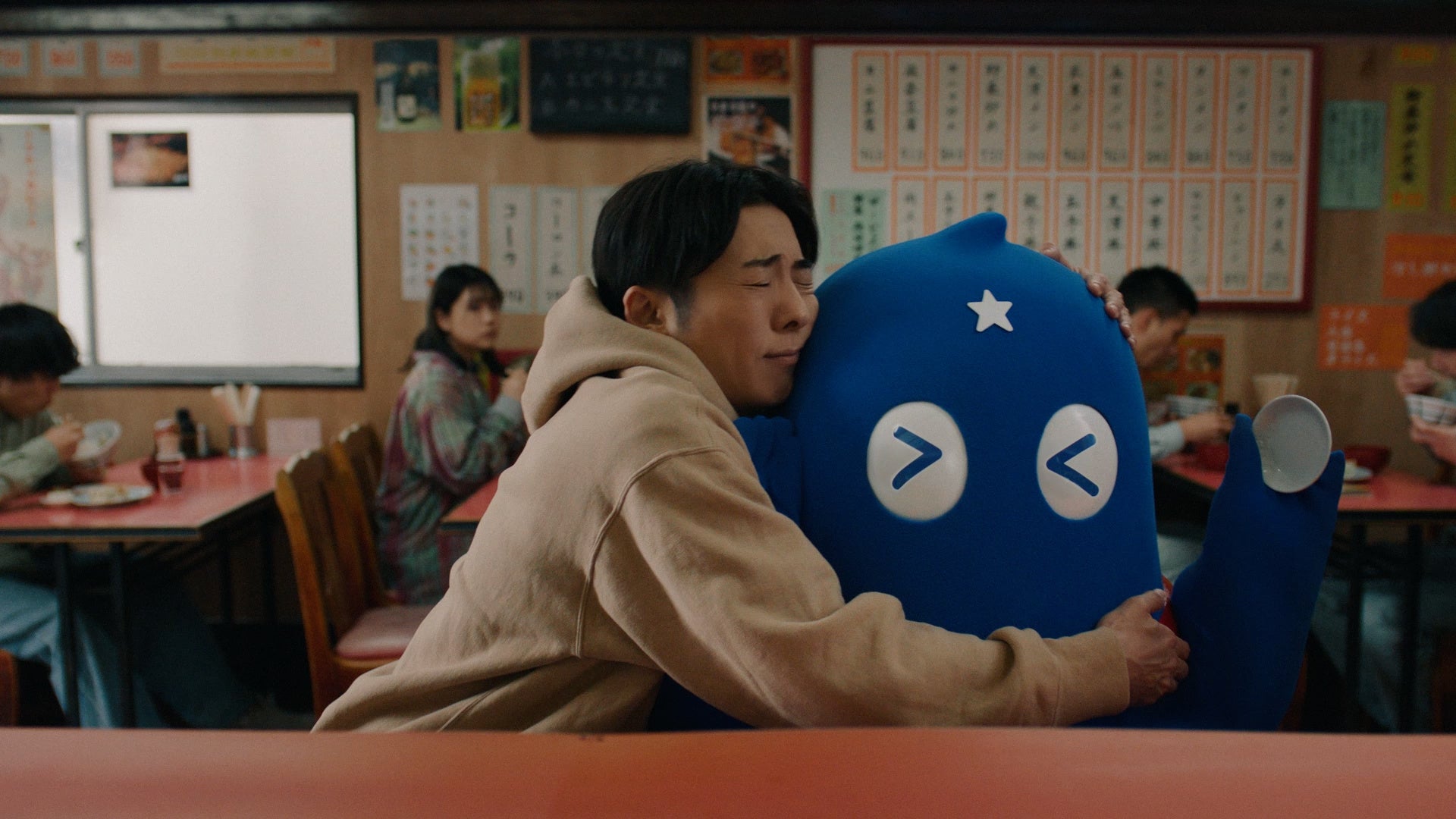 撮影は新CM全3篇に応じて海辺、中華料理店、公園の3か所で行われ、撮影を重ねるごとにウミオスとの交流が深まる高橋さんの姿が印象的でした。各撮影では、資料や動き方をスタッフと真剣に確認される高橋さんのプロフェッショナルな一面が光りました。海辺や中華料理店のシーンでは、高橋さんとウミオスがバリエーション豊かなハグを披露。新生命体「ウミオス」に寄り添う温かさを全力で表現しました。