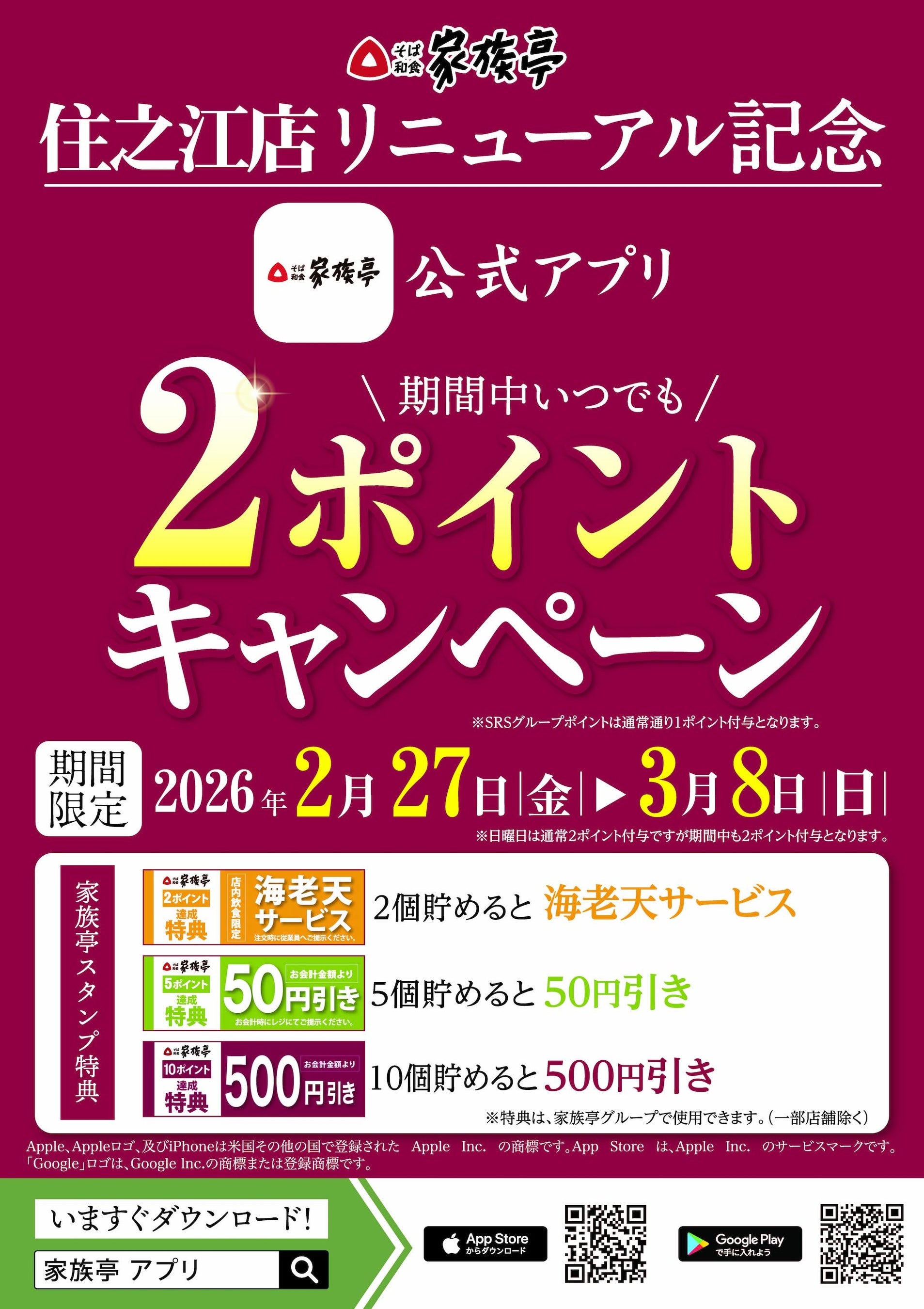 【家族亭アプリスタンプ2ポイントキャンペーン概要】