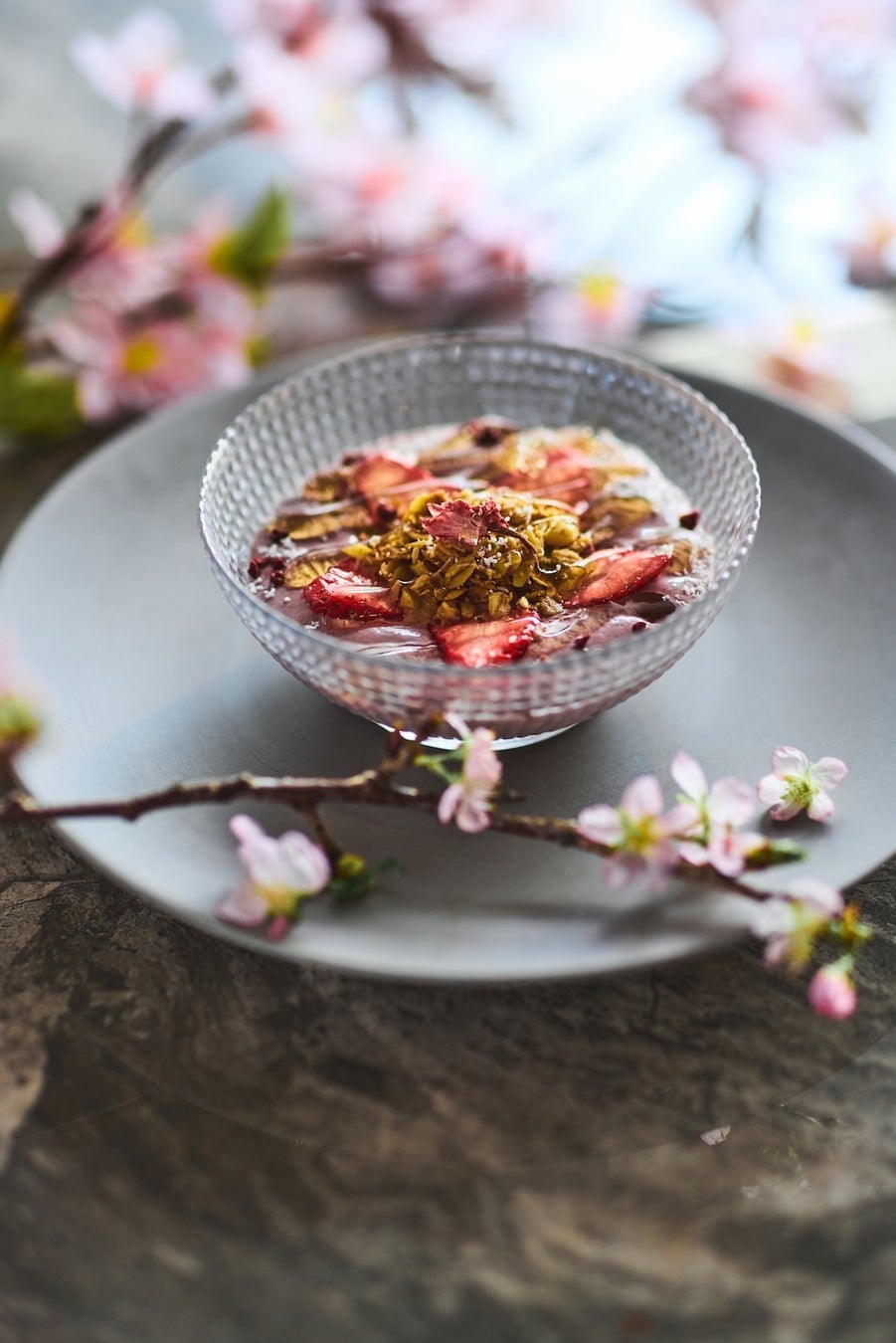目黒川の水面を美しく染め上げる桜の花びらをイメージした、心ときめく春のパンケーキ。生地は体に優しいグルテンフリーで、その上に、お芋の優しい甘みが広がる濃厚なペーストをたっぷりと絞りました。桜を練り込んだアイスクリームの繊細な香りと、フレッシュな苺の酸味が重なり、濃厚ながらも驚くほどさっぱりとした後味です。ひと口ごとに、春の川辺を散策しているような心地よいひとときをお届けします。¥1,980(税込)