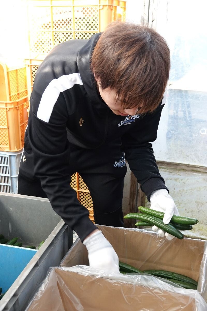 JA西三河きゅうり部会の皆さまのご支援のもと「西田のきゅうり」プロジェクトで育てていたきゅうりを、#19西田優大選手が収穫し、西尾市内のこども食堂へ寄贈いたしました。