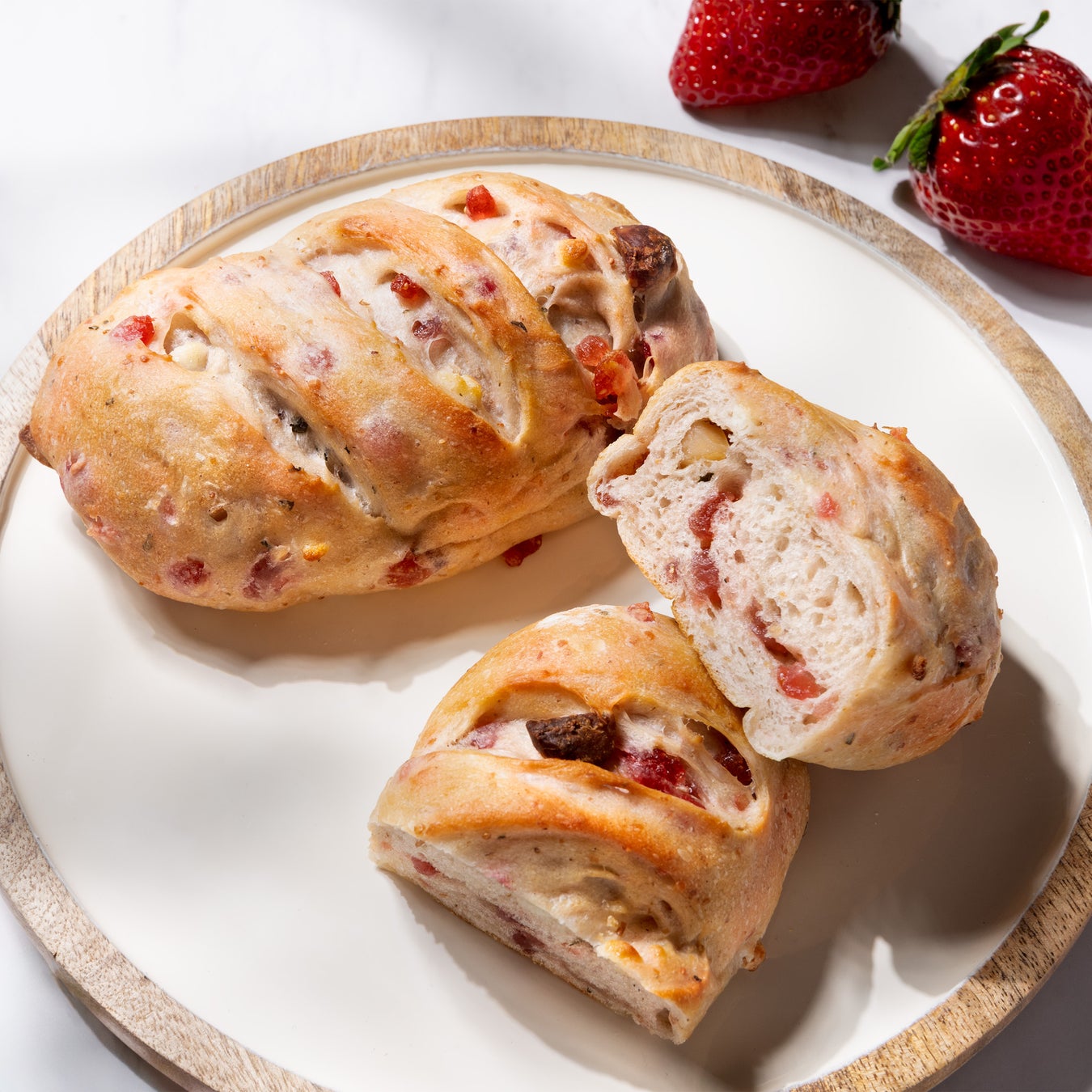 ドライストロベリー、マカダミア、ホワイトチョコの入ったカンパーニュ。ほのかに香るバジルとオリーブオイルがアクセント。