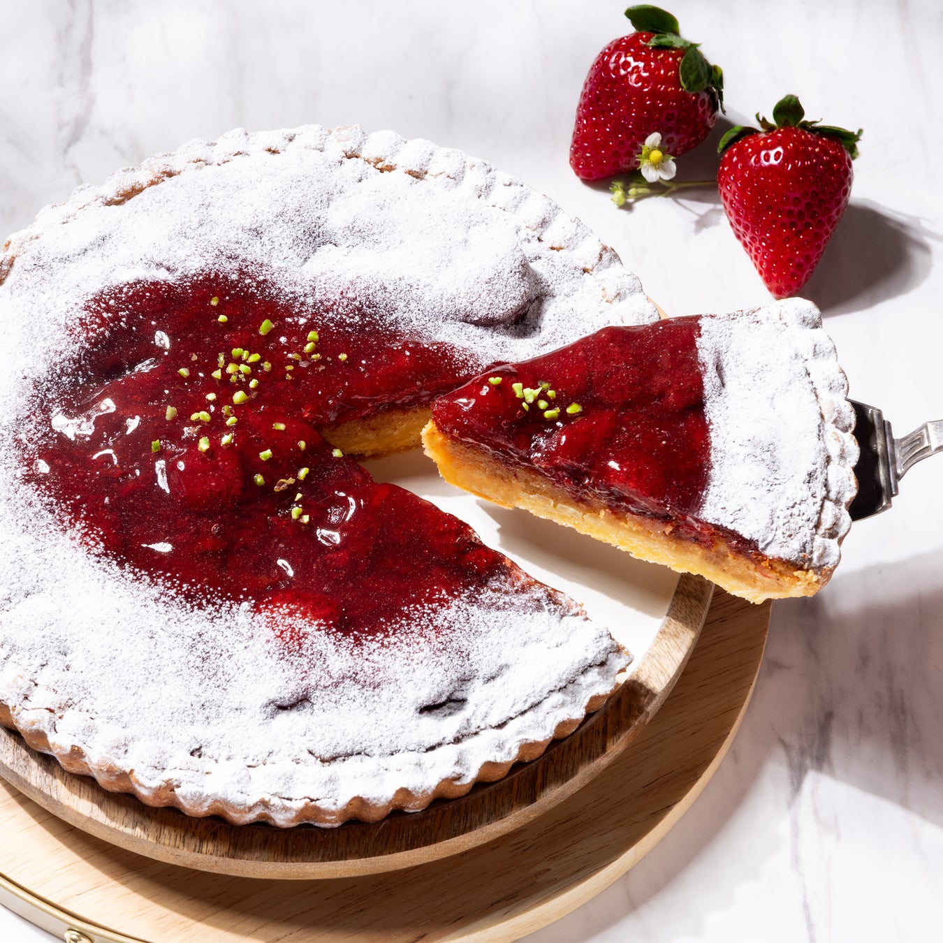 いちご果汁を合わせた風味豊かなアーモンドクリームと、甘酸っぱいいちごの味わいがひろがるタルト。