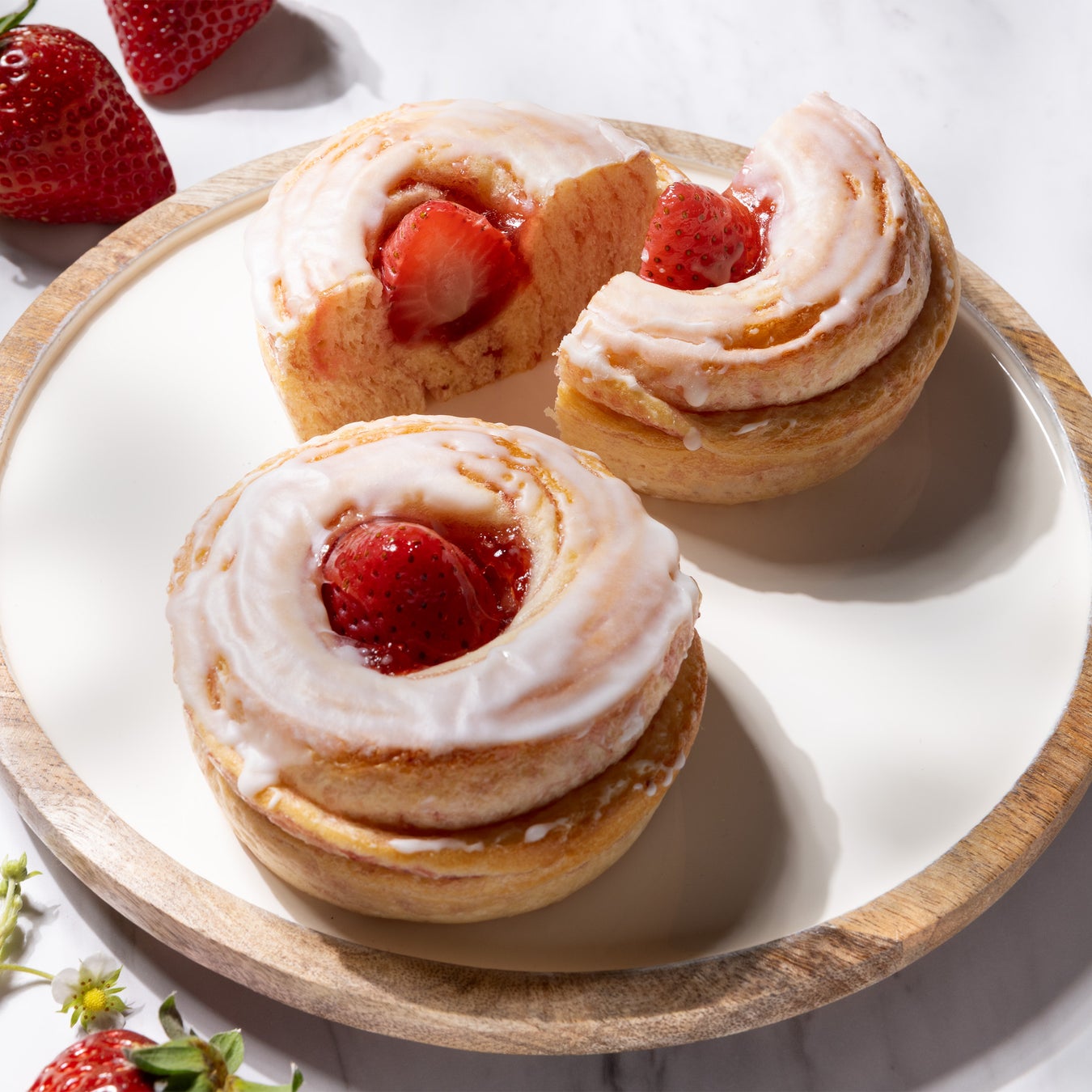 いちごジャムを巻き込んだロールパンにフレッシュのいちごをのせ、練乳入りのアイシングで仕上げました。