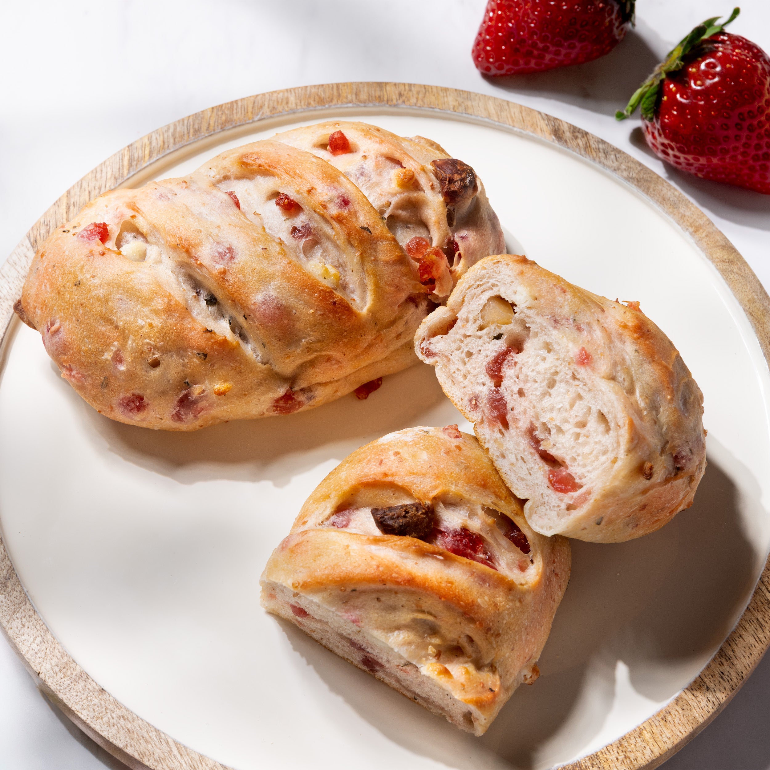 ドライストロベリー、マカダミア、ホワイトチョコの入ったカンパーニュ。ほのかに香るバジルとオリーブオイルがアクセント。