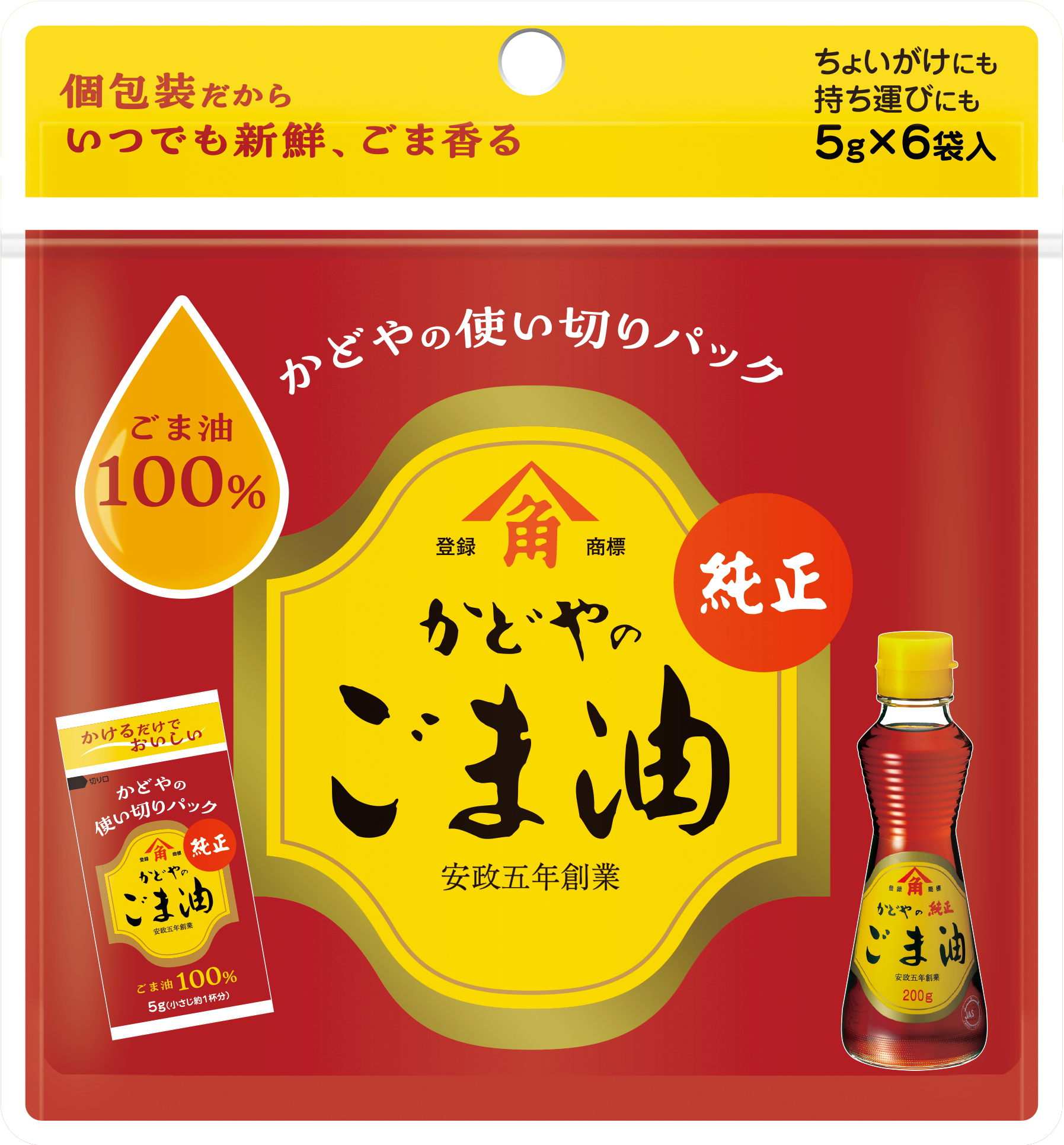 かどや製油では、純正ごま油を調理時に使用するだけでなく、食べる直前に“かける”ことでごま油の風味を最大限楽しむ使い方を提案いたします。今回発売する使い切りパックは、外出先や職場など、さまざまなシーンでごま油の“かける使い”を気軽に取り入れられるよう開発いたしました。中食・個食化が進むなかで寄せられた「少量だけ使いたい」「外でも使いたい」というお客様の声に応え、個包装だからいつでも新鮮、“かける・香る・仕上がる!”を実現できる商品として発売いたします。