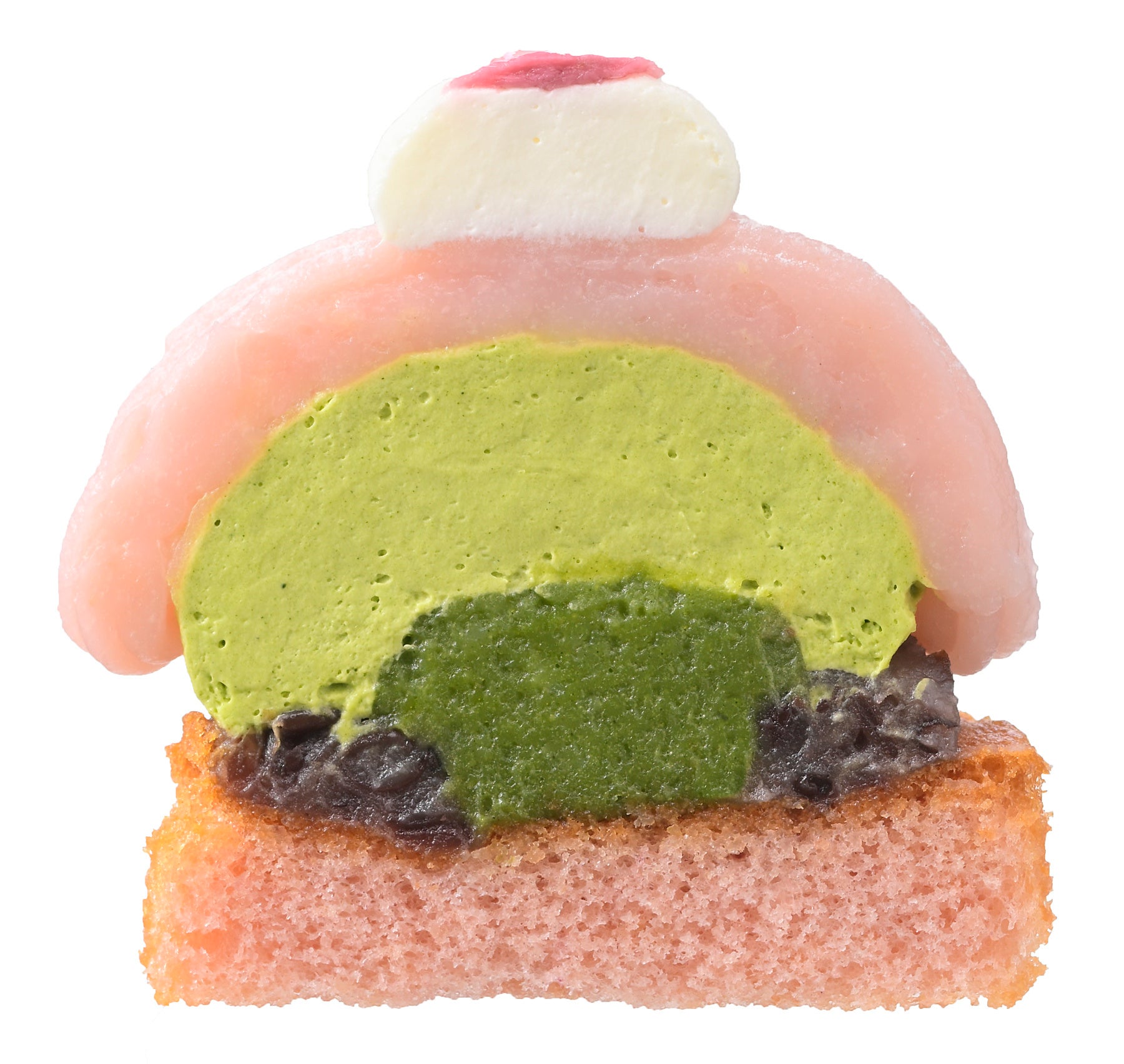 特長:桜風味マドレーヌに粒あんと抹茶あん、ほどよい苦みの抹茶クリームを重ね、桜あんで包み込みました。ちょこんとのせた桜花の塩漬けが、味わいのアクセントになっています。