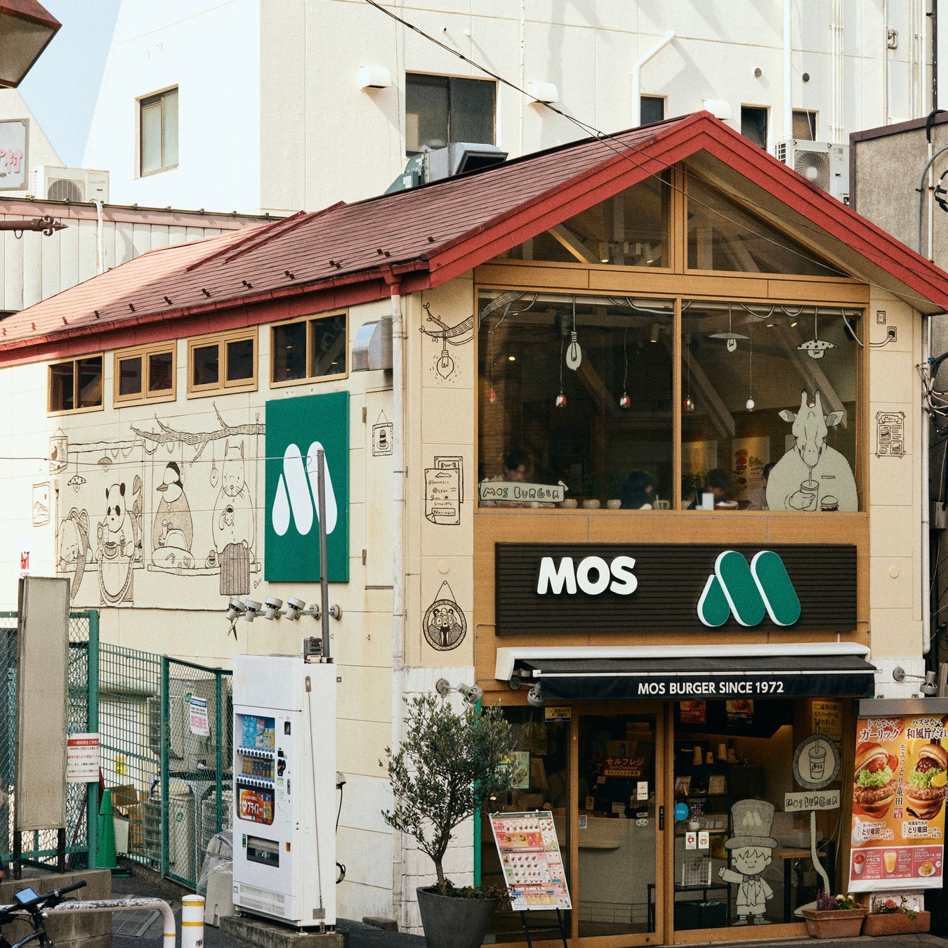 1972年に板橋区成増で開業した、モスバーガーの1号店。八百屋の倉庫を借りた小さな店舗からス タートし、幾度かの改装を経て2階建ての店舗となった現在も、創業店として地域の方々に支えられ、営業を続けています。また、創業当初から大切にしてきた「人を大切にする」という考え方は、現在の全国のモスバーガー店舗の運営にも反映されています。