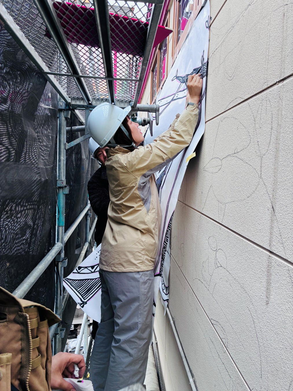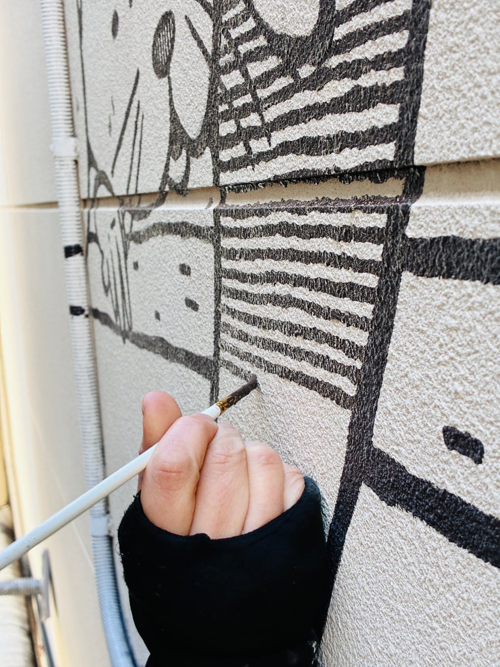 壁面アートは初の挑戦でした。初めて店舗の壁面を見た際には、こんなに大きなところに描くのかと改めてびっくりしましたし、普段使わない筆での描画ということもあり、どう描くか試行錯誤しながらの制作でした。しかし、不安よりも挑戦できることのワクワクが勝り、様々な方の応援もあって本当に楽しく向き合うことができました。また、サポートしてくれる方々との会話を通し気づけたことが多く、自分だけではできない表現をすることができたと思います。