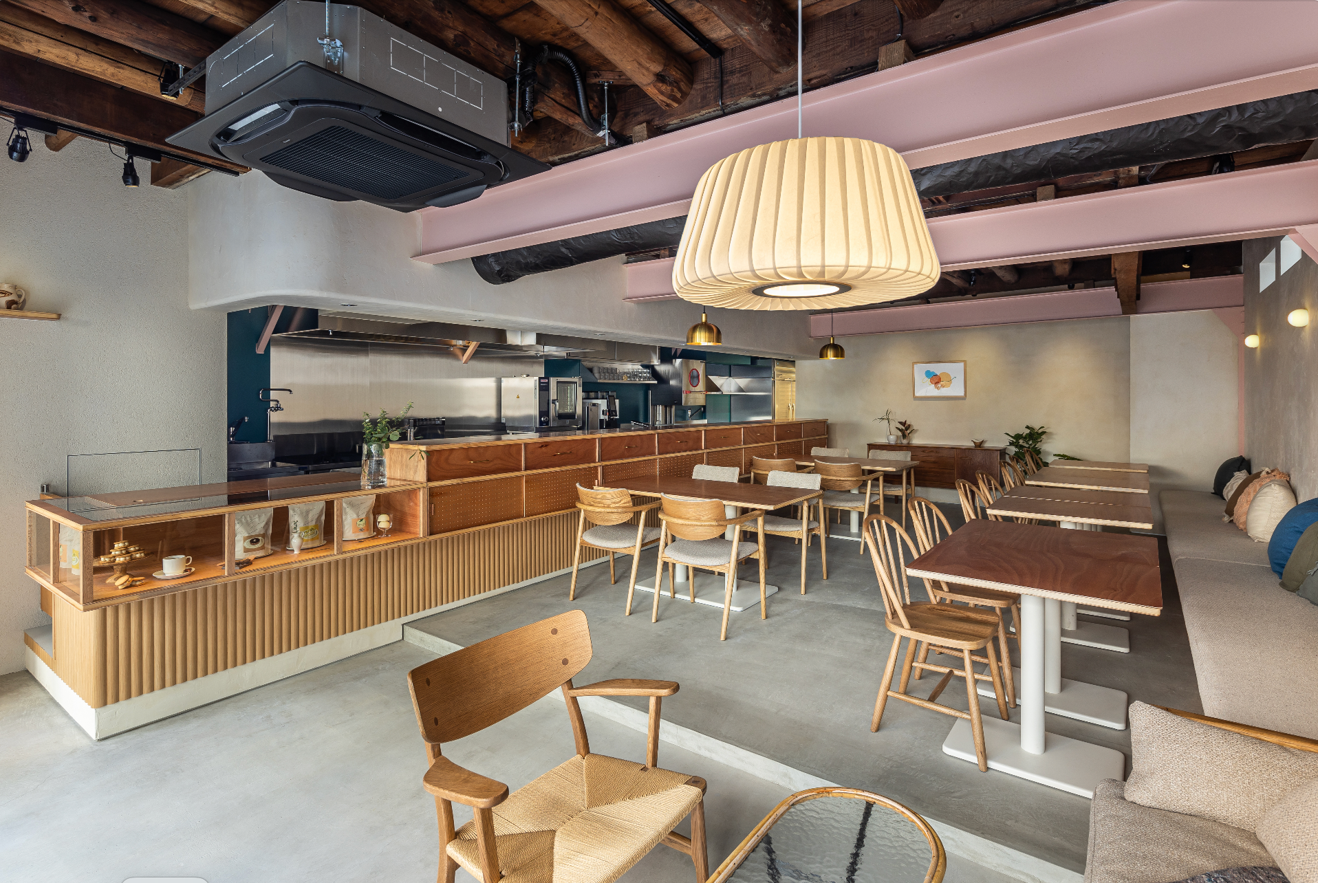 アースカラー(ピンク・グレー)を基調に、ウッディな素材とパステル調の配色で柔らかな印象を演出。テーブル席やソファ席を備え、開放感のある入り口と温かみのある照明が、ゆったりとくつろげる空間を生み出しています。