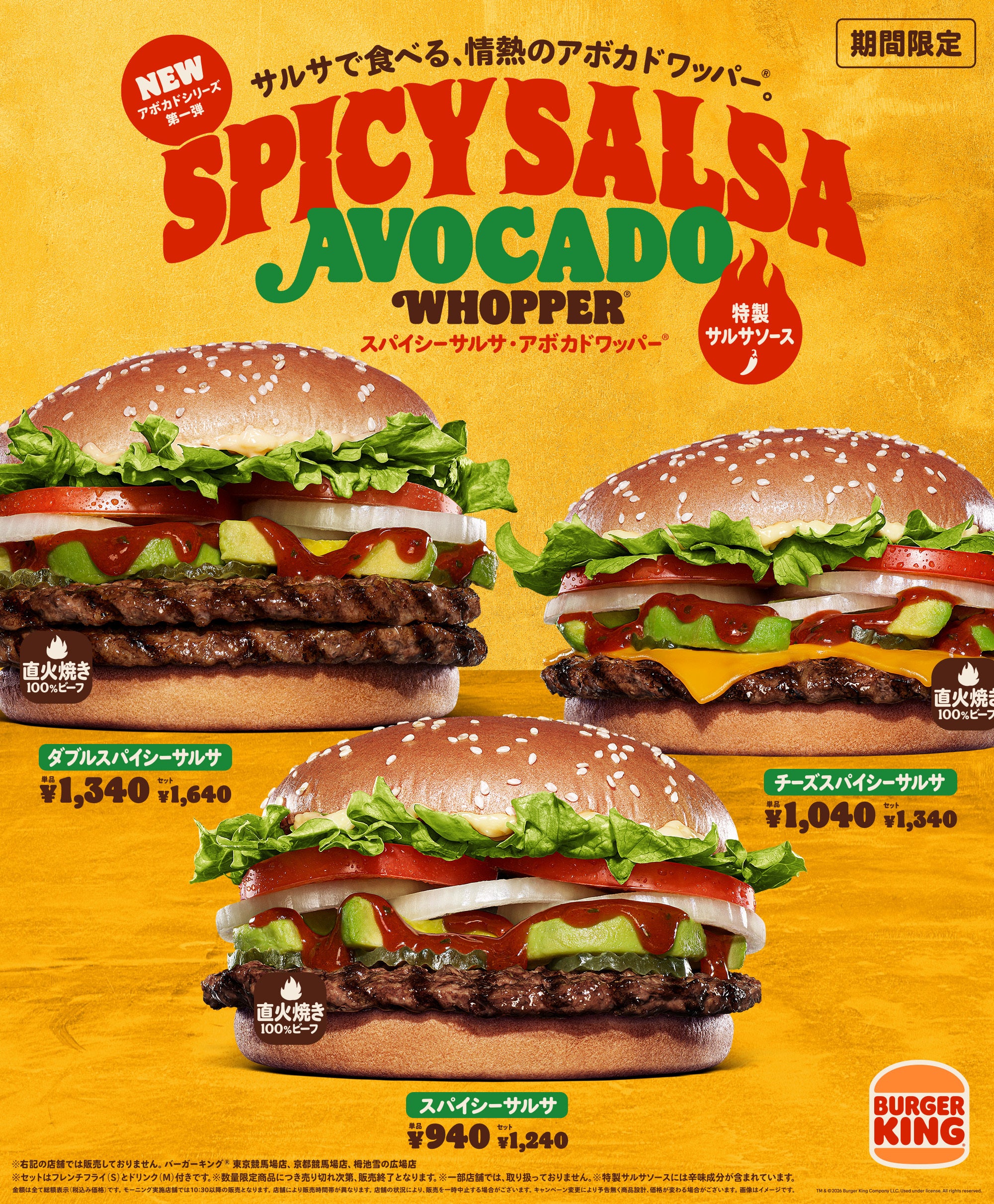 バーガーキング® の「アボカドワッパー® 」ファンの皆様も、ピリ辛好きの皆様も、ぜひこの機会にバーガーキング® 自慢の直火焼きの100%ビーフパティと「特製サルサソース」を使用した、期間限定商品『スパイシーサルサ アボカドワッパー® 』『ダブルスパイシーサルサ アボカドワッパー® 』『チーズスパイシーサルサ アボカドワッパー® 』の3商品をお楽しみください。