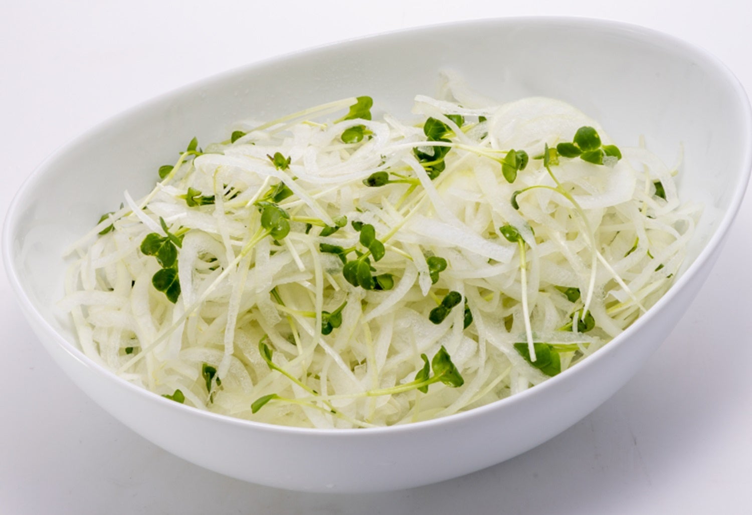 薄くスライスしたオニオンとかいわれを合わせました。ステーキの鉄板で温めたり、スープに入れて食べるのもおすすめです。