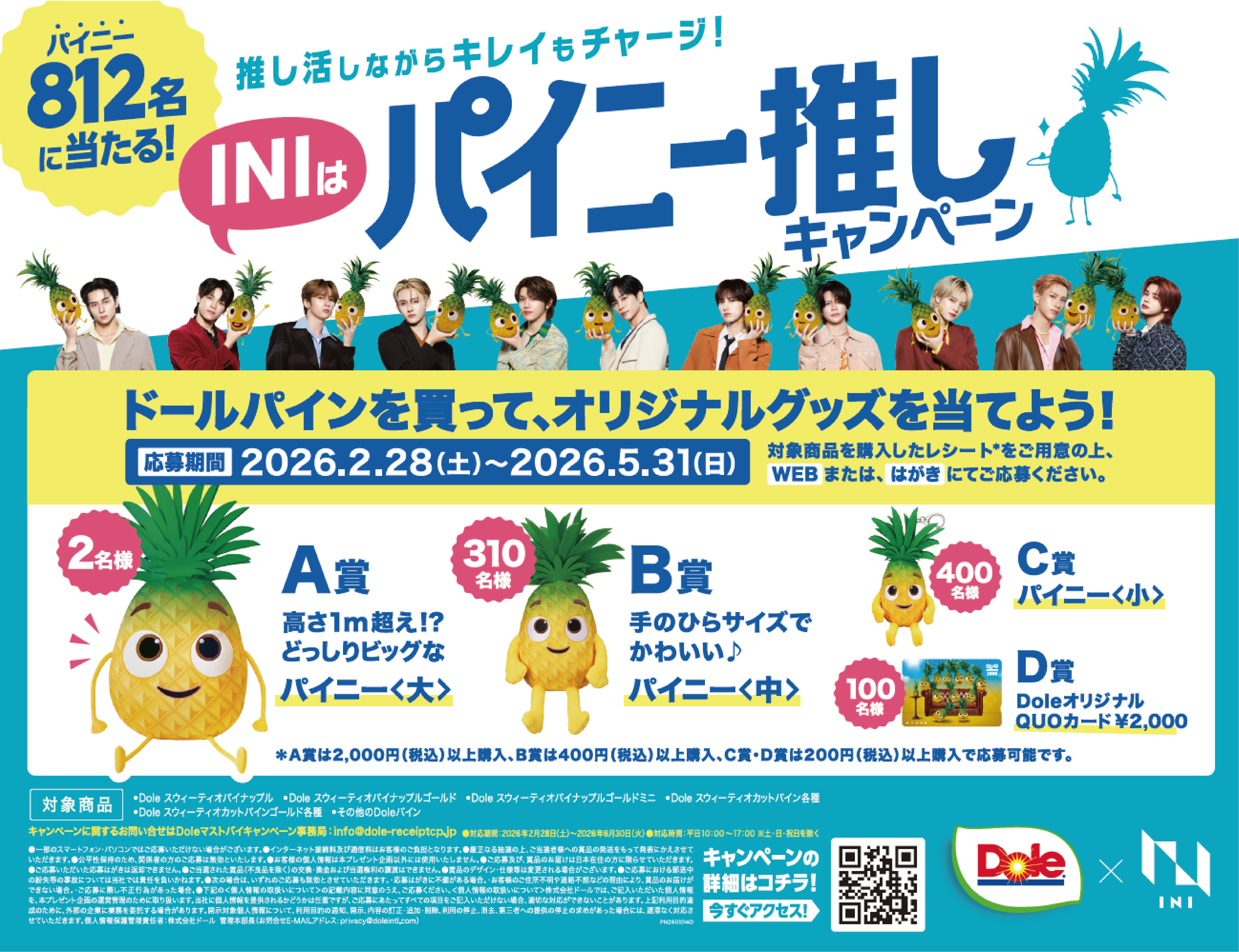 スマイルを。」というブランドメッセージのもと、「パイナップル由来グルコシルセラミド」を摂るために1日80gの『スウィーティオパイナップル(機能性表示食品)』を食べる活動「プル活®」を推進しています。この度Doleでは、肌のゆらぎが気になるこれからの季節を「プル活®」でサポートする『推し活しながらキレイもチャージ!INIはパイニー推しキャンペーン』を、2026年2月28日(土)より実施いたします。