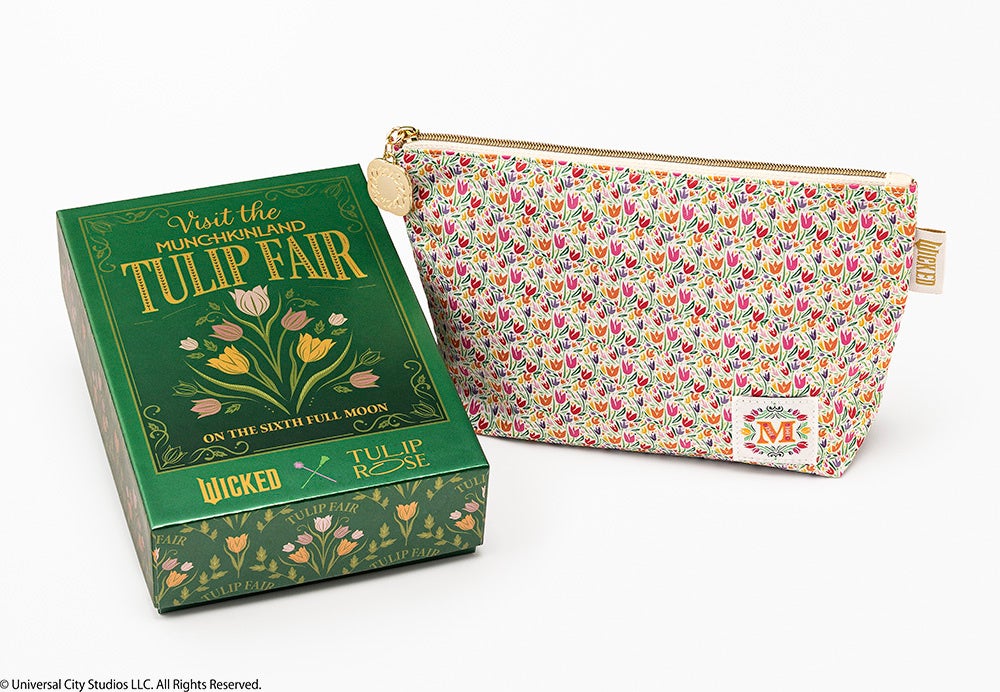 映画に登場する舞台の一つである“マンチキンランドに広がるチューリップ畑”をテーマにしたコラボレーションアイテム。「TOKYO TULIP ROSE」のブランドカラーと映画『ウィキッド 永遠の約束』で共通する“深いグリーン”が印象的なスペシャルボックス『WICKED edition』と、総柄デザインが華やかなオリジナルポーチが一緒に楽しめる『ポーチセット』は自分用としてはもちろんプレゼントにもおすすめです。ポーチは小物が収納しやすい内ポケット付き。チャーム部分には「TOKYO TULIP ROSE」のブランドロゴをあしらった、こだわりのデザインです。