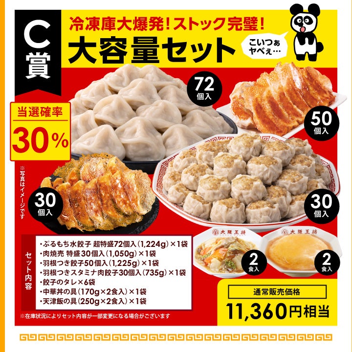 販売価格は6,500円ですが、9,490円相当以上のセットが当たります。大阪王将の中華料理をご自宅でお楽しみください。