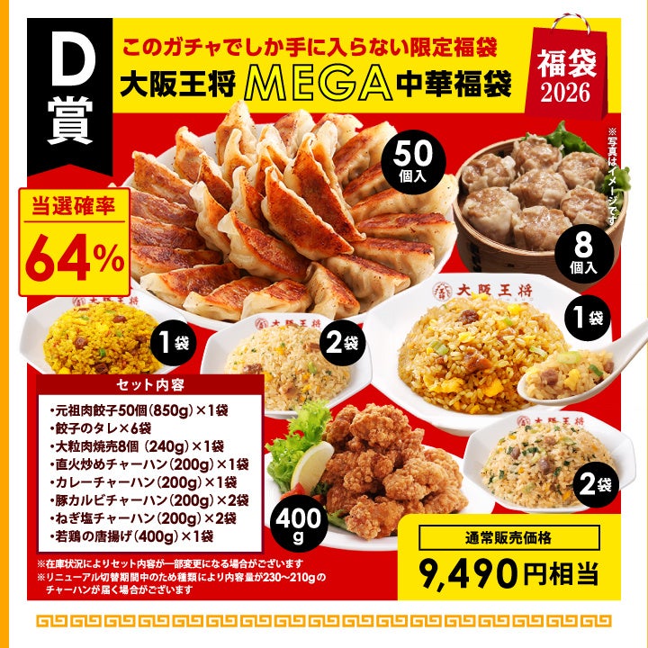 イートアンドグループで冷凍食品販売のEC事業を手がける株式会社ナインブロック(所在地:大阪府大阪市 代表取締役社長:池田道隆)は、大阪王将公式通販サイト( https://o-ohsho.jp/ )および楽天市場・Yahoo!ショッピングをはじめとする各種ECモールにて、2026年2月26日(木)より『大阪王将 MEGA中華ガチャ2026』の販売を開始いたします。