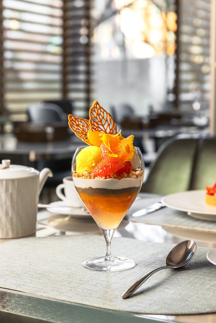 トップには、みずみずしいデコポンとピンクグレープフルーツの果肉に、爽やかなデコポンソルベと塩ミルクジェラートを重ねて。柑橘の軽やかな酸味と塩ミルクのまろやかなコクが溶け合い、甘いチュイールの食感がアクセントを添えます。
