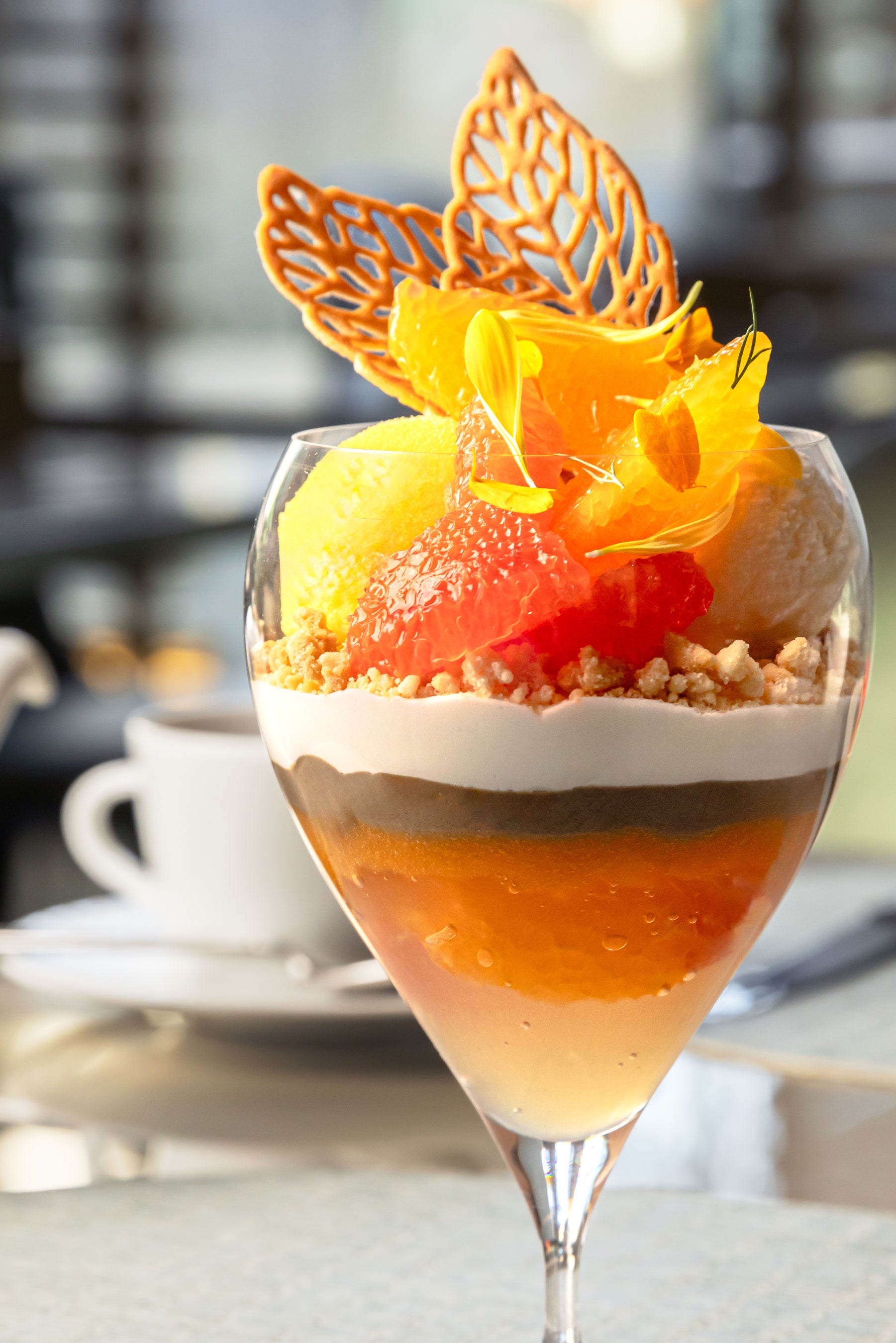 トップには、みずみずしいデコポンとピンクグレープフルーツの果肉に、爽やかなデコポンソルベと塩ミルクジェラートを重ねて。柑橘の軽やかな酸味と塩ミルクのまろやかなコクが溶け合い、甘いチュイールの食感がアクセントを添えます。
