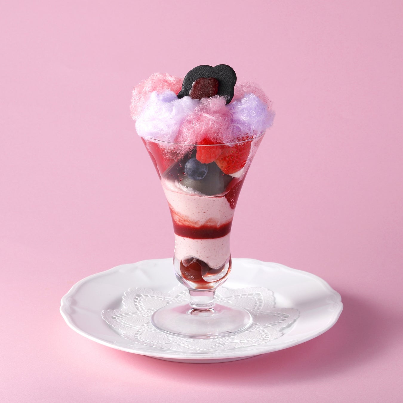 仲條が手がけたプレートのデザインから着想を得たデザート。甘酸っぱいチェリークリームと、ほろ苦いショコラシャーベットのマリアージュに、ふわりと可愛らしい綿あめを添えて、遊び心あふれるひと皿に。色と味で楽しむ、ポップでユーモラスなデザートです。