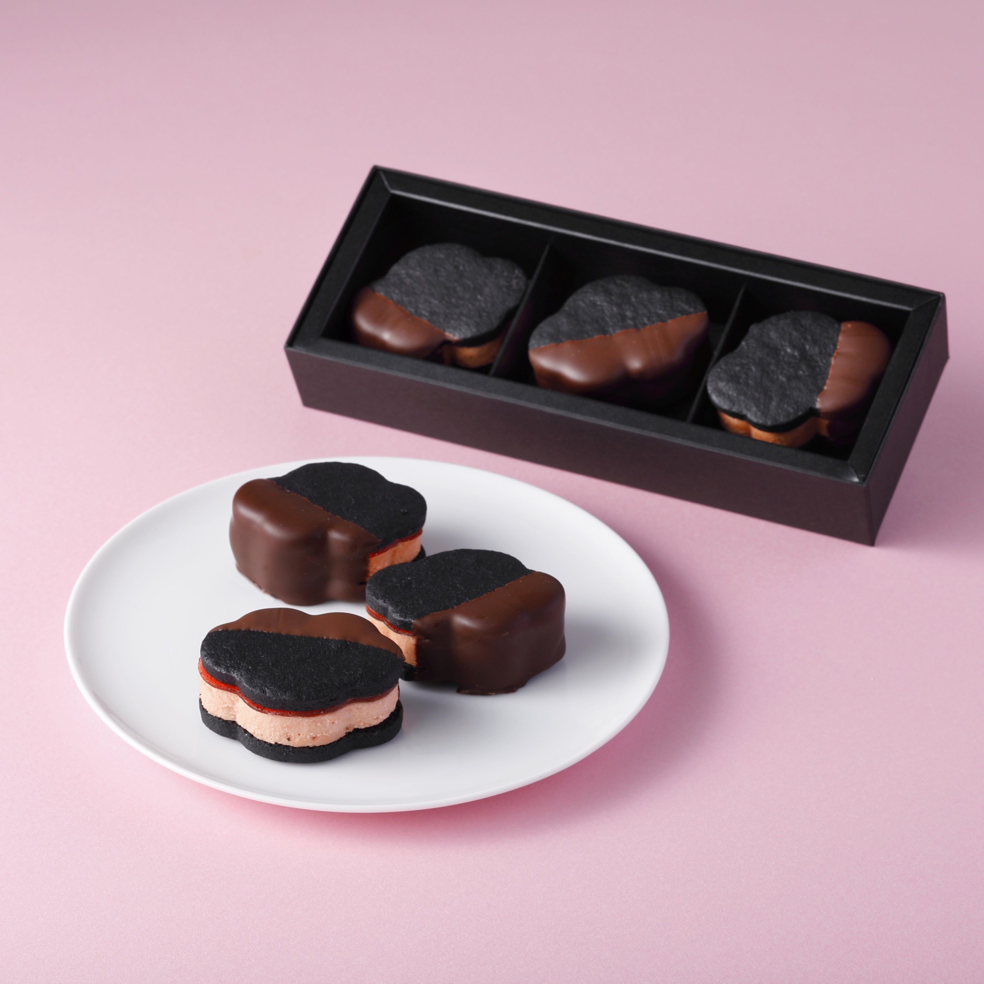 仲條デザインの椿を模したサンド菓子。お皿の漆黒をイメージして仕上げた竹炭サブレで、いちご味のバタークリームとパートドフリュイをサンドし、アクセントでチョコをコーティングしました。