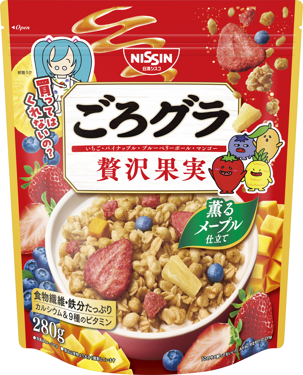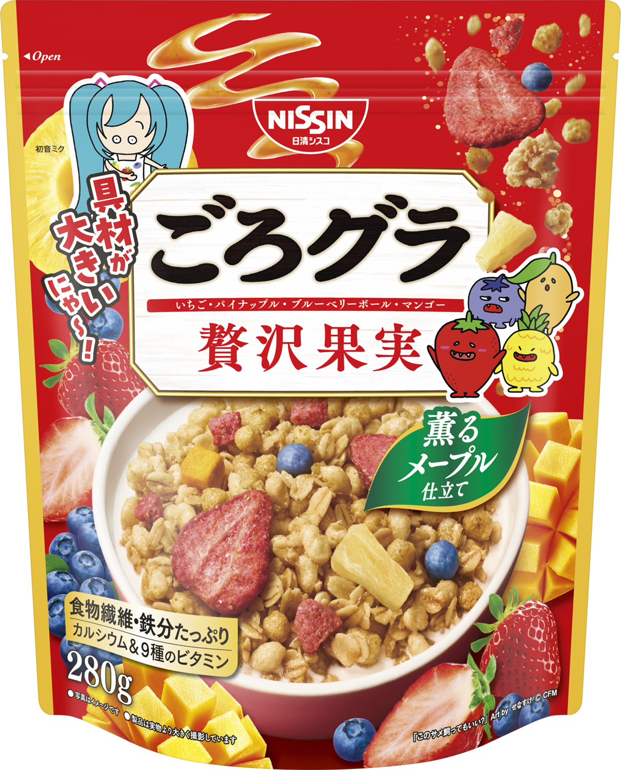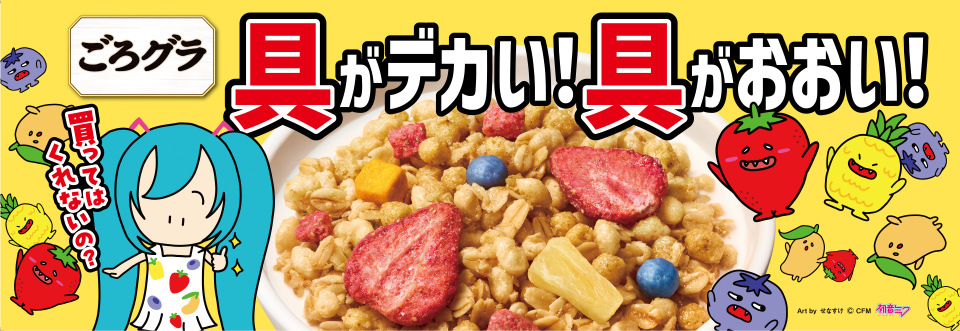 また、テレビCMの放映にあわせ、「ごろグラ 贅沢果実」のパッケージに初音ミクと「具材キャラクター」が期間限定で登場します。