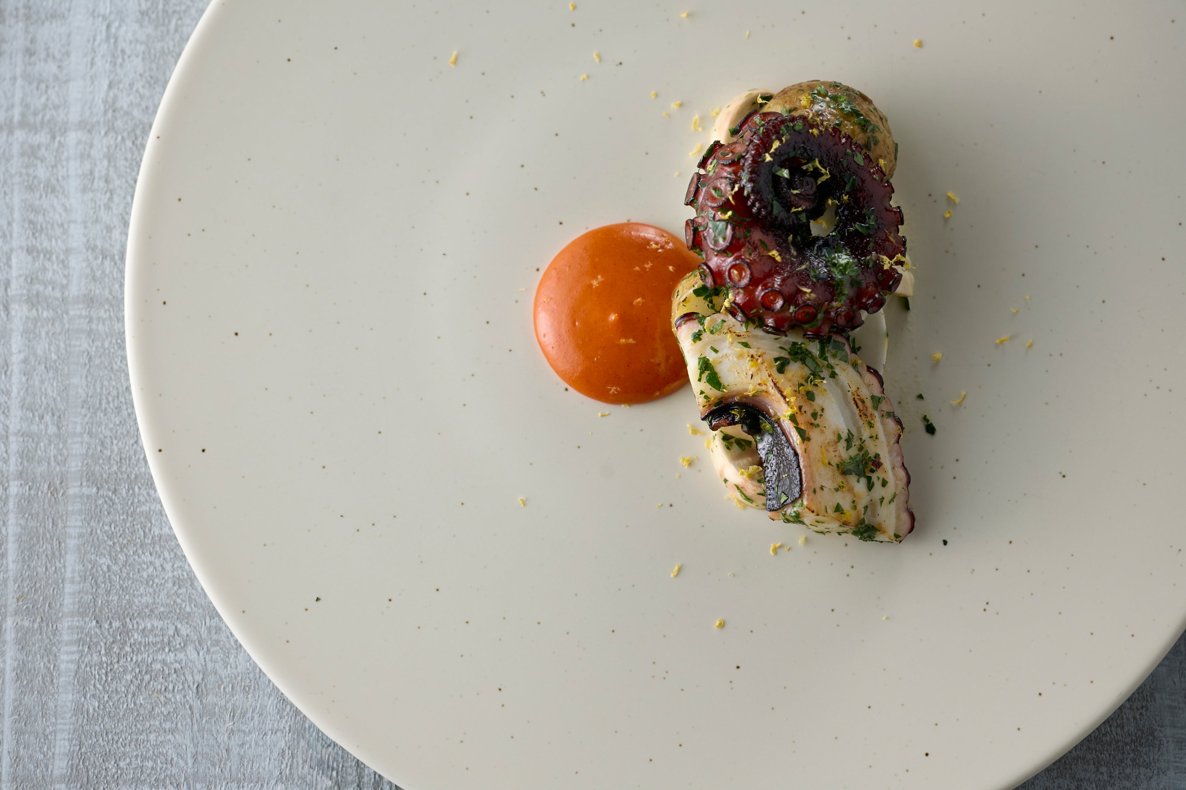 香ばしく炙った真蛸に、新じゃがいもを合わせ、当社の長期熟成味噌『大寒仕込み味噌 渾』を用いた赤パプリカソースで仕上げました。『大寒仕込み味噌 渾』は、こだわりの大寒仕込み・天然醸造味噌を数種ブレンドし、米糀の上品な甘みと深い熟成の旨みが調和した奥行きのある味わいが特長です。発酵の力が素材の個性を引き立てる一皿です。
