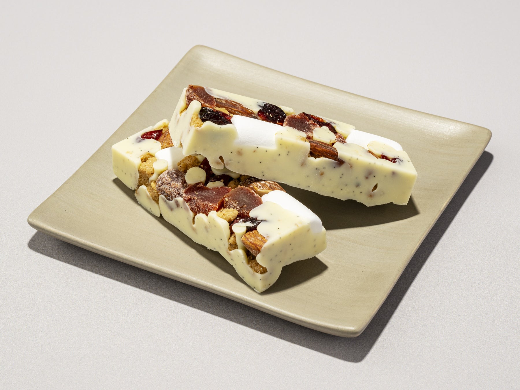 その断面は、美しさの層。バニラ香る白チョコに、ローストしたナッツ、凝縮された果実、サクサクのクランブルを贅沢に閉じ込めました。なめらかさと歯ごたえが交差する、ドラマチックな味わい。自分へのご褒美にもぴったりです。