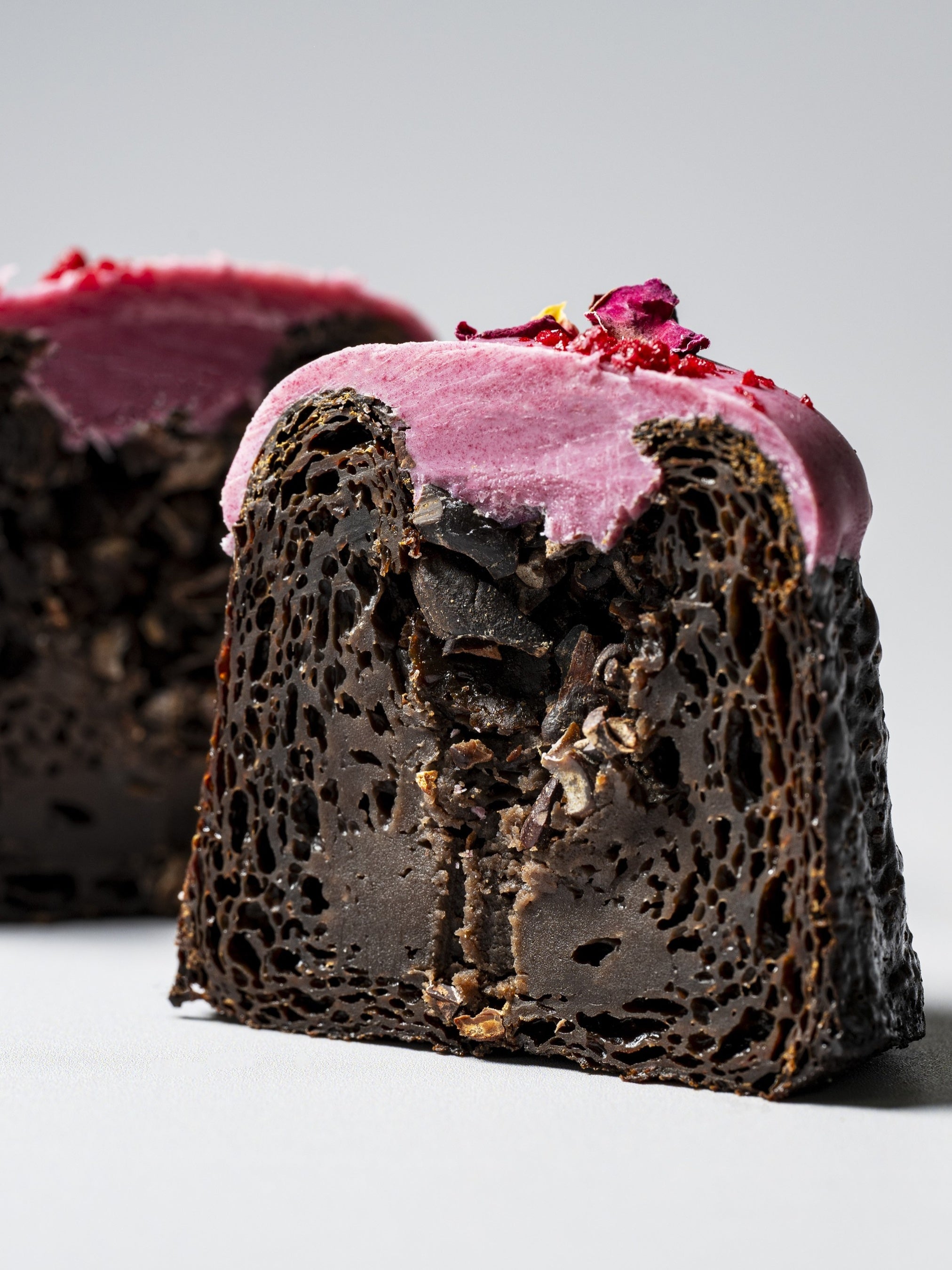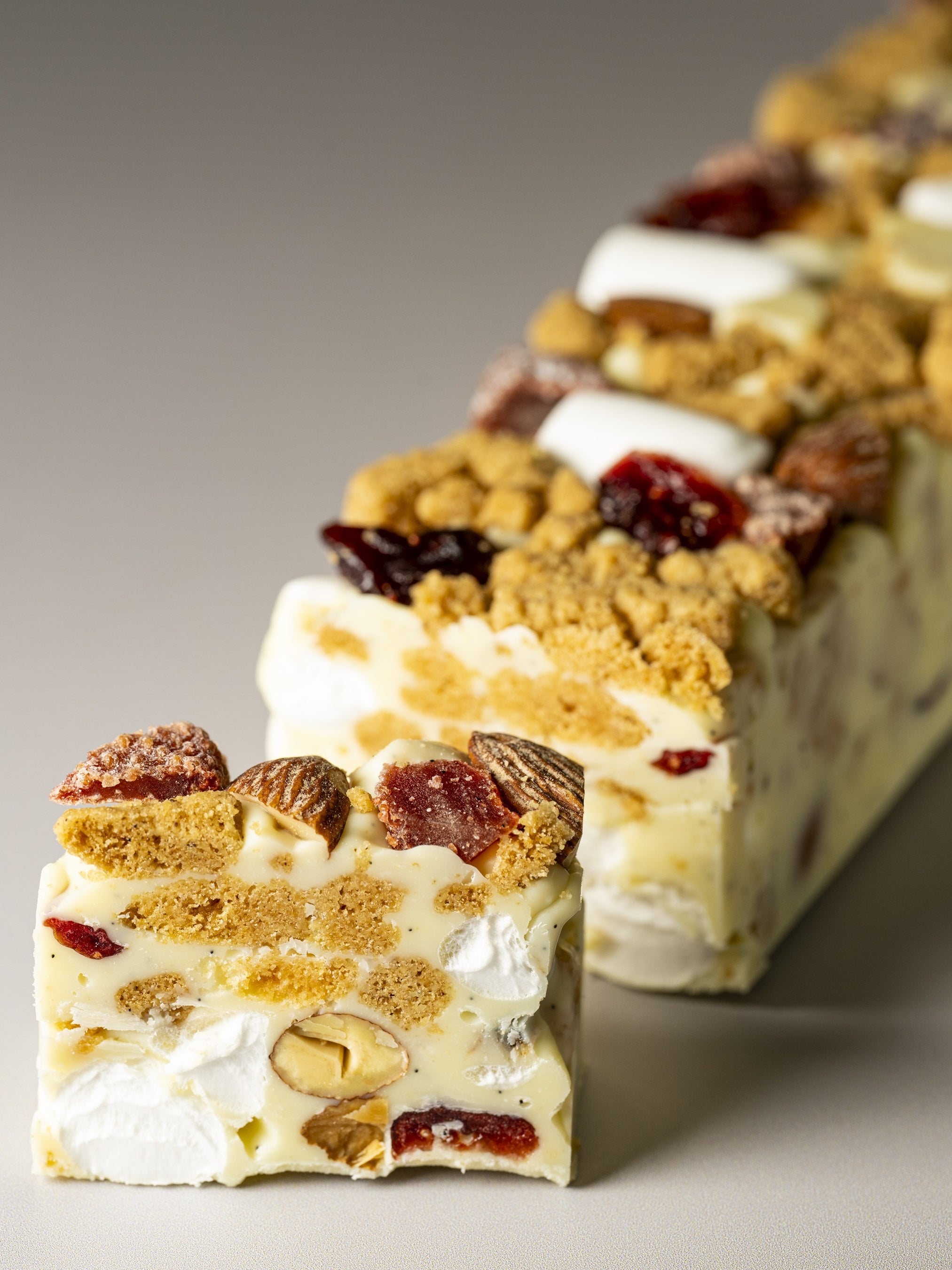 その断面は、美しさの層。バニラ香る白チョコに、ローストしたナッツ、凝縮された果実、サクサクのクランブルを贅沢に閉じ込めました。なめらかさと歯ごたえが交差する、ドラマチックな味わい。自分へのご褒美にもぴったりです。