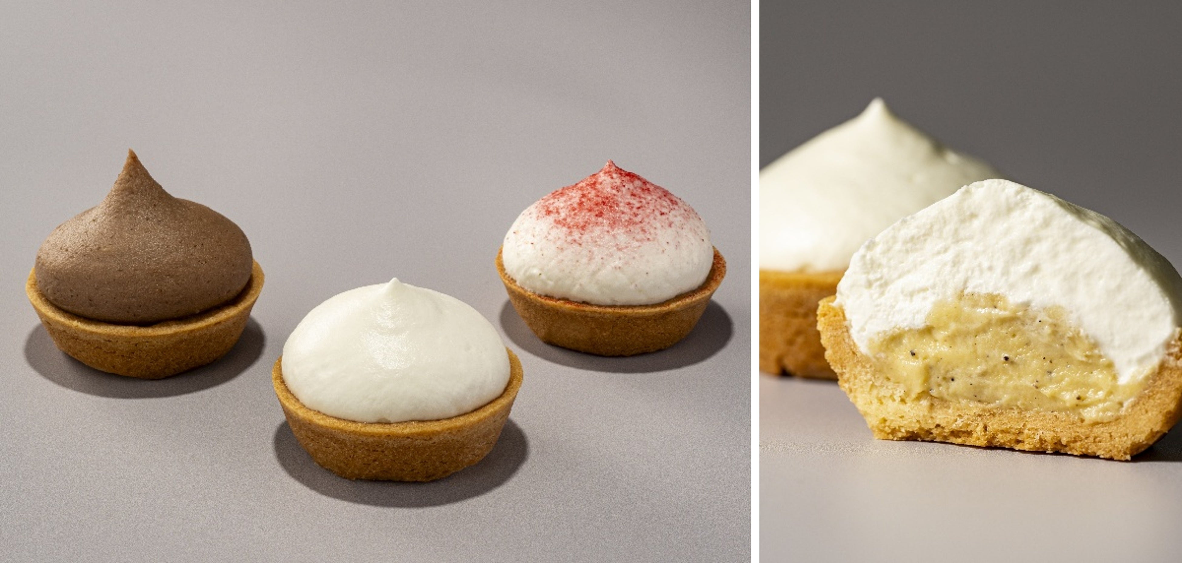 コンセプトは「シュークリームのタルト版」。直径6cmの生地に、プレーンは特製カスタードと北海道根釧産の生クリームを重ね、2~3口でほお張れる気軽な「おやつタルト」です。シンプルだからこそ素材の良さが際立つ、専門店ならではの本格的な味わいです。※販売時間:11:00前後~