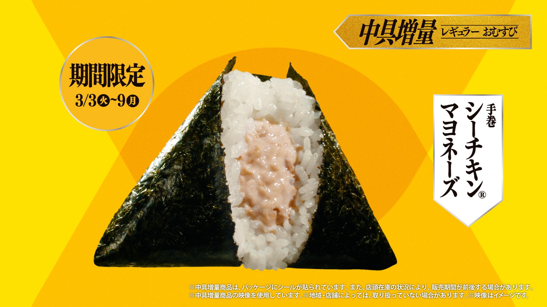 「大きなおむすび」は、通常の手巻おむすびの約1.5倍※というボリュームから、「1個で満足したい」というニーズに応える人気シリーズです。今回は食感と美味しさをさらに追求し、半分にカットした煮たまごが入った「マヨたま肉そぼろ」のほか、2種類の具材が相性抜群の「明太子と鮭マヨネーズ」、これまでより中の具材を増やした「昆布とツナマヨネーズ」をラインアップ。さらに、定番手巻おむすび・直巻おむすびの6種類も中具を増量し、これまで以上の美味しさと満足感をお届けします。