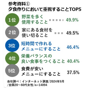 ①健康意識の高まりと共働き子育て世代の増加を背景に、夕食作りで「野菜摂取」と「時短」が重視されています
