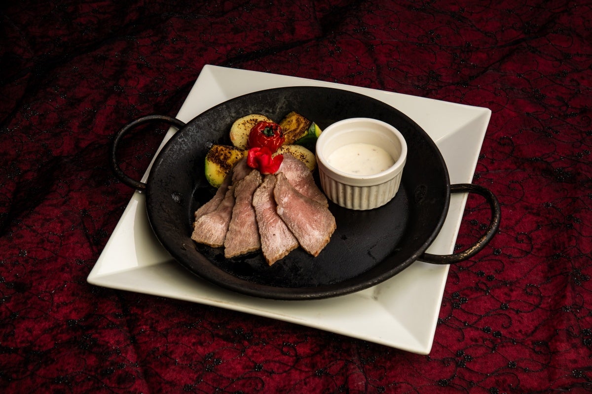 サシもほどよく入った和牛肉に絶妙な火入れを施して旨みを余すところなく閉じ込めた館自慢の肉料理に、西洋わさびが奏でるシャープな辛さと酸味が特徴のソースを合わせた、この期間だけに供されるスペシャリテ。鉄板には目の前で火も掛けられ、闇に揺らめく炎に、ロマンティックな雰囲気も最高潮に。