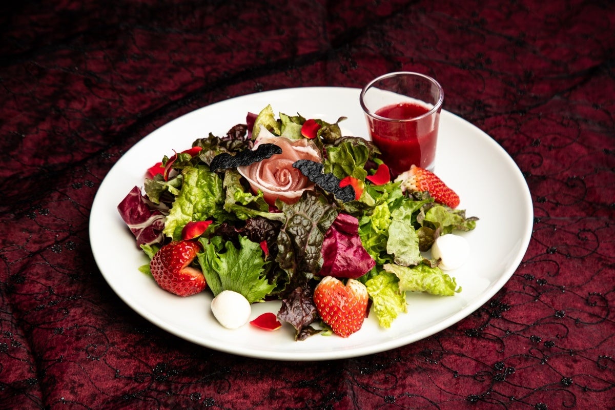 愛しき者の血に漂う吸血コウモリ〜イチゴと生ハムのサラダ フランボワーズドレッシング〜 死した野菜を呪文によって美味しく甦らせる儀式の執行は、館の日常茶飯事ではありますが、このひと月に限っては、野菜たちの中に恋心をかたどったいちごが、秘めた想いとともに隠れているようです。さぁ今こそ、魔の力を借りて呪文で血を注ぎ、秘めた恋心を想い人に伝える勇気をもらってしまいましょう…!