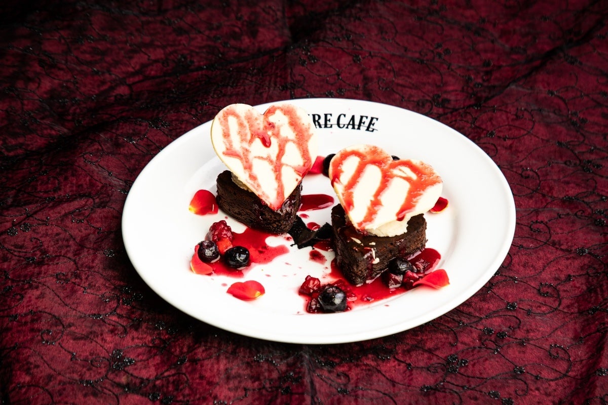 魔力に翻弄されている内に宴はあっという間にフィナーレの時。姿を現すのは、しっとりと濃厚なガトーショコラ、甘い香りを放つバニラアイス、そしてホワイトチョコレートのハート…そして血の如く赤いベリーのソースが!愛は”甘い”だけに留まらないことを、何故か吸血鬼が示す象徴的なデザートです。