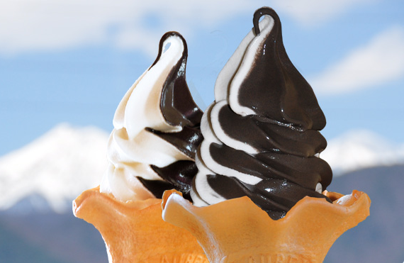 看板商品の「モーモーソフト」は、白い部分に生乳を50%配合したソフトクリームを使用し、ナチュラルでやさしい味わいに仕上げています。黒い部分には3種のスペイン産ビターチョコレートをブレンドし、濃厚なカカオと生クリームの風味が広がります。口どけが良く、なめらかな食感をお楽しみいただけます。