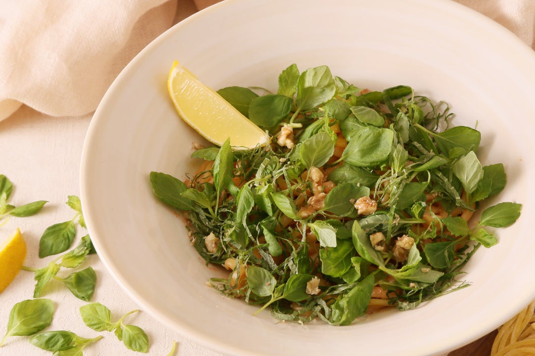 たっぷりの大葉と、大葉のベビーリーフペリーラが一面に広がるまさに大葉畑なパスタ。大葉の下にはみんな大好き明太バターのパスタが隠れています。もちっとした生麺で食べ応えも抜群な一皿。
