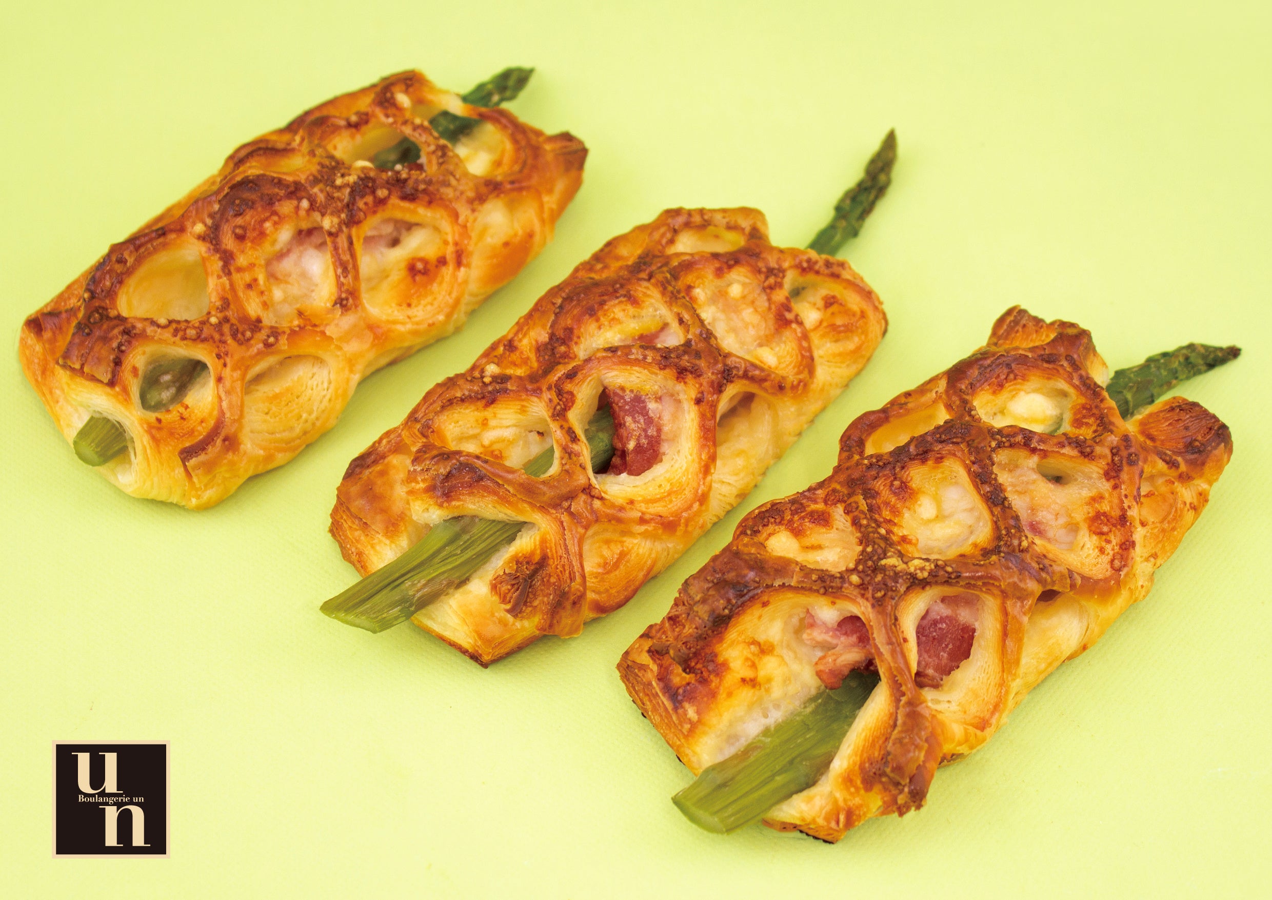 デニッシュ生地にアスパラとイベリコ豚を使用したベーコンを包み焼き上げました。春が旬の鮮やかなグリーンが目を引くアスパラ。ベーコンの塩気とジューシーさがアクセントになり、お食事としてはもちろん、おつまみにも最適な惣菜パンです。