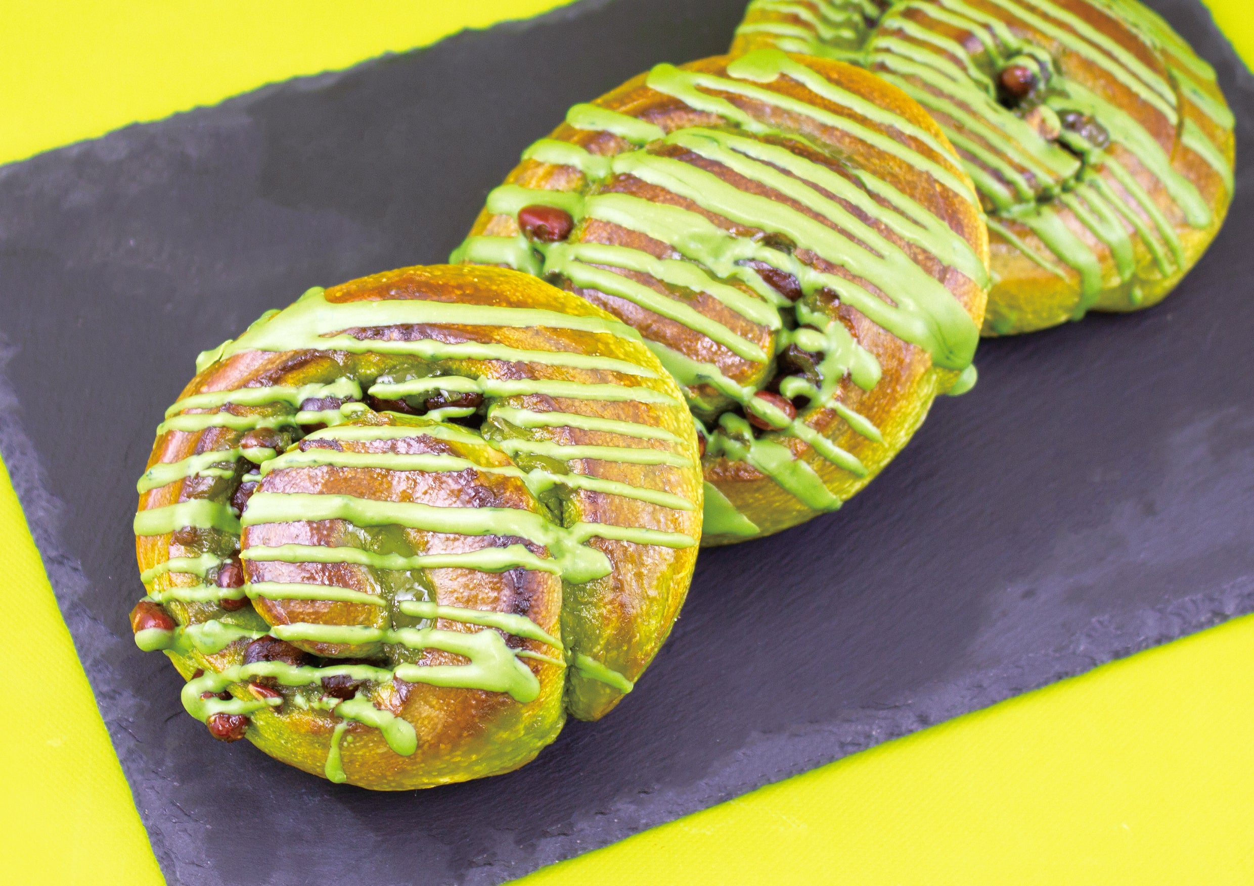 宇治抹茶を練り込んだ生地に抹茶クリームと大納言納豆を巻き込み焼き上げました。抹茶の深みと大納言の優しい味わいが調和した和スイーツパン。表面の抹茶チョコのラインが、見た目の美しさと甘みを引き立てます。