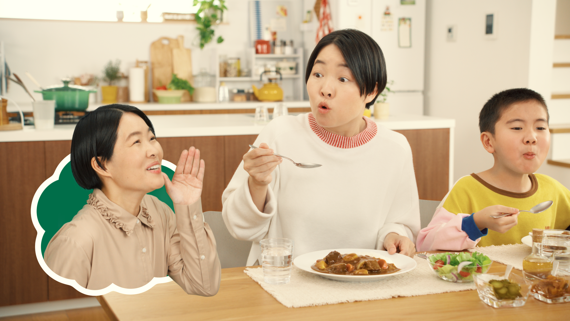 さらに、製品特徴である2つのルウが混ざり合うイメージや、食欲をそそるシズルカットにもこだわり、「こくまろ」のおいしさが視覚的にも伝わる内容に仕上げました。家族みんなで味わう、温かい家庭的な雰囲気で、こくまろの魅力を存分に感じられるCMです。