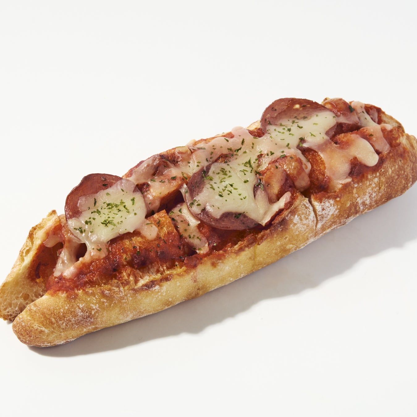 スヴィンゴールドバゲットにピザソースを塗り、ジューシーなソーセージとサラミをのせ焼き上げました。