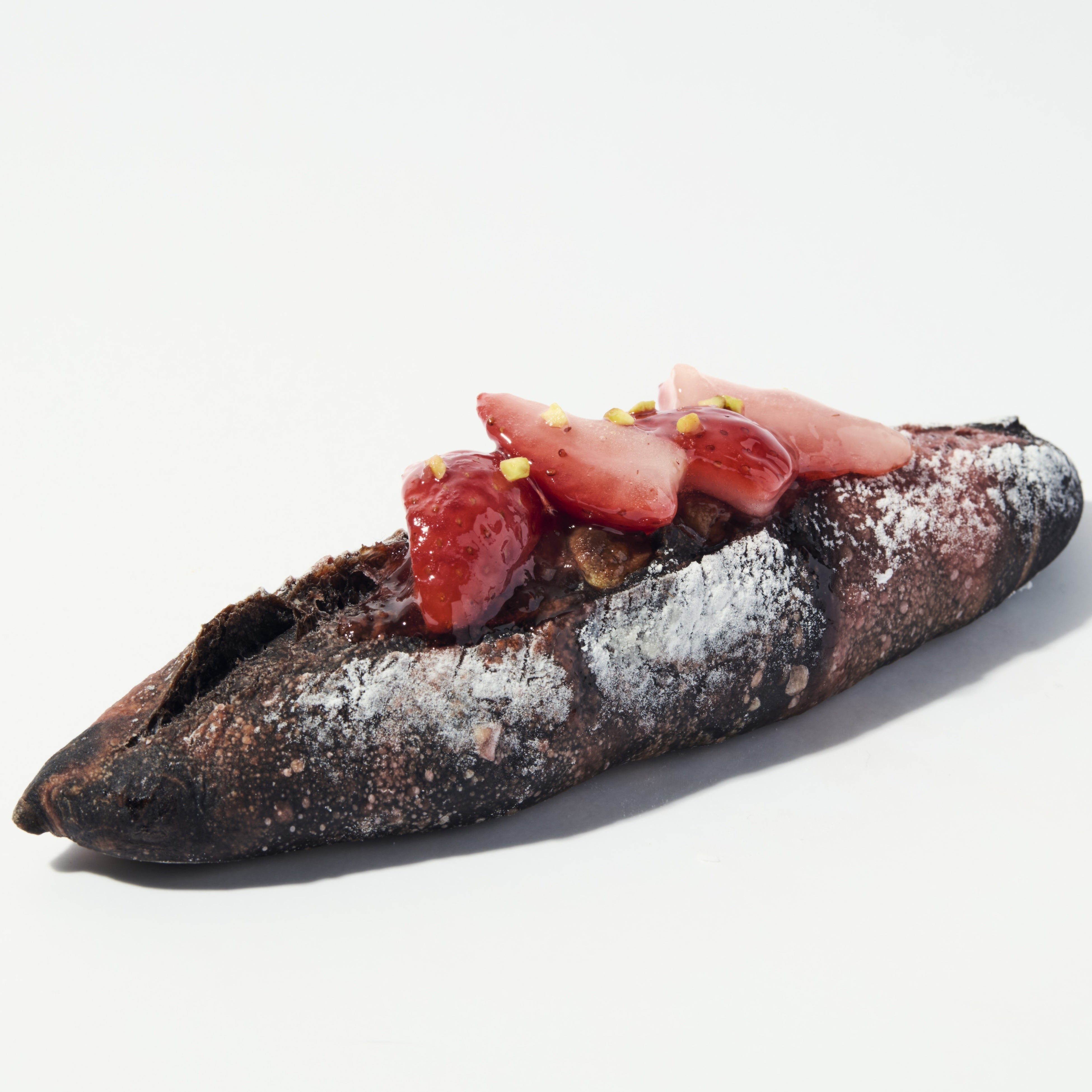 マーブル模様のバゲットに国産イチゴ、いちごジャム、ピスタチオをトッピング。