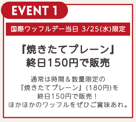 なお、《国際ワッフルデー》当日の3月25日(水)には丸い形のリエージュワッフルを焼きたてで提供する『焼きたてプレーン』をキャンペーン価格で販売いたします。