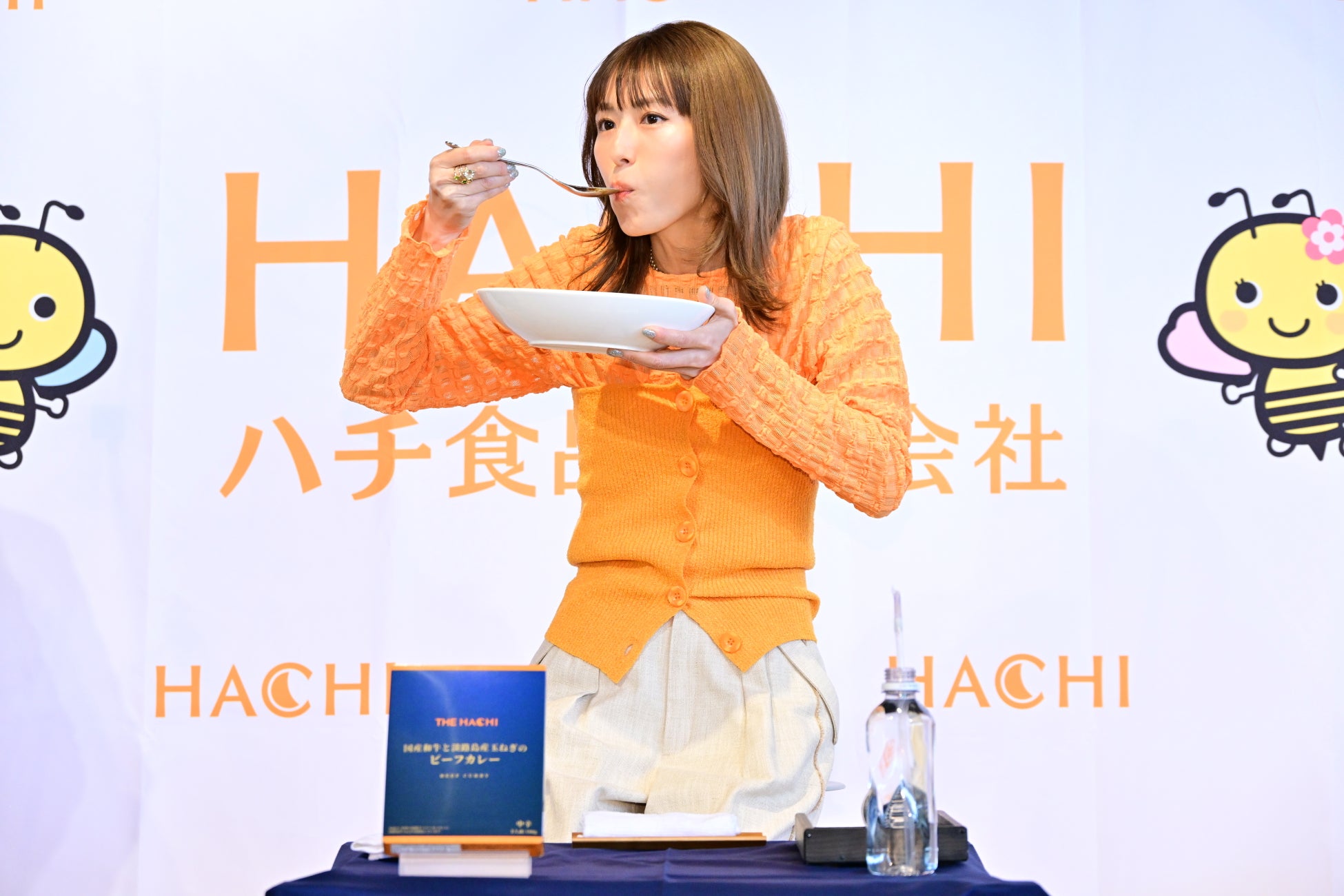 新商品の中から『THE HACHI 国産和牛と淡路島産玉ねぎのビーフカレー』の試食を実施。ひとくち食べて、若槻さんは「本当にお店の味ですね。これを家で食べられるのはありがたい! ちょっとピリ辛で、私は辛いのは苦手なのですが、この中辛は子どもでも食べられる。とても美味しいです」と絶賛されました。
