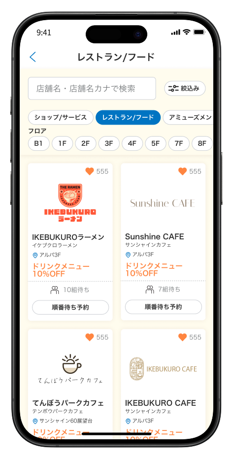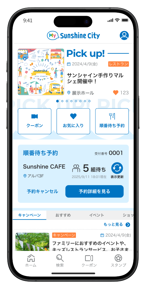 「サンシャインシティ」で利用できるお得なクーポンの配布や、ユーザーの興味に合わせてイベント情報等をお届けするアプリ「My Sunshine City」に順番待ち予約サービスが連携されます。アプリ上で行きたい飲食店の検索から混雑状況を確認し、順番待ち予約まで行えるようになり、さらに便利で手放せないアプリとなりました。