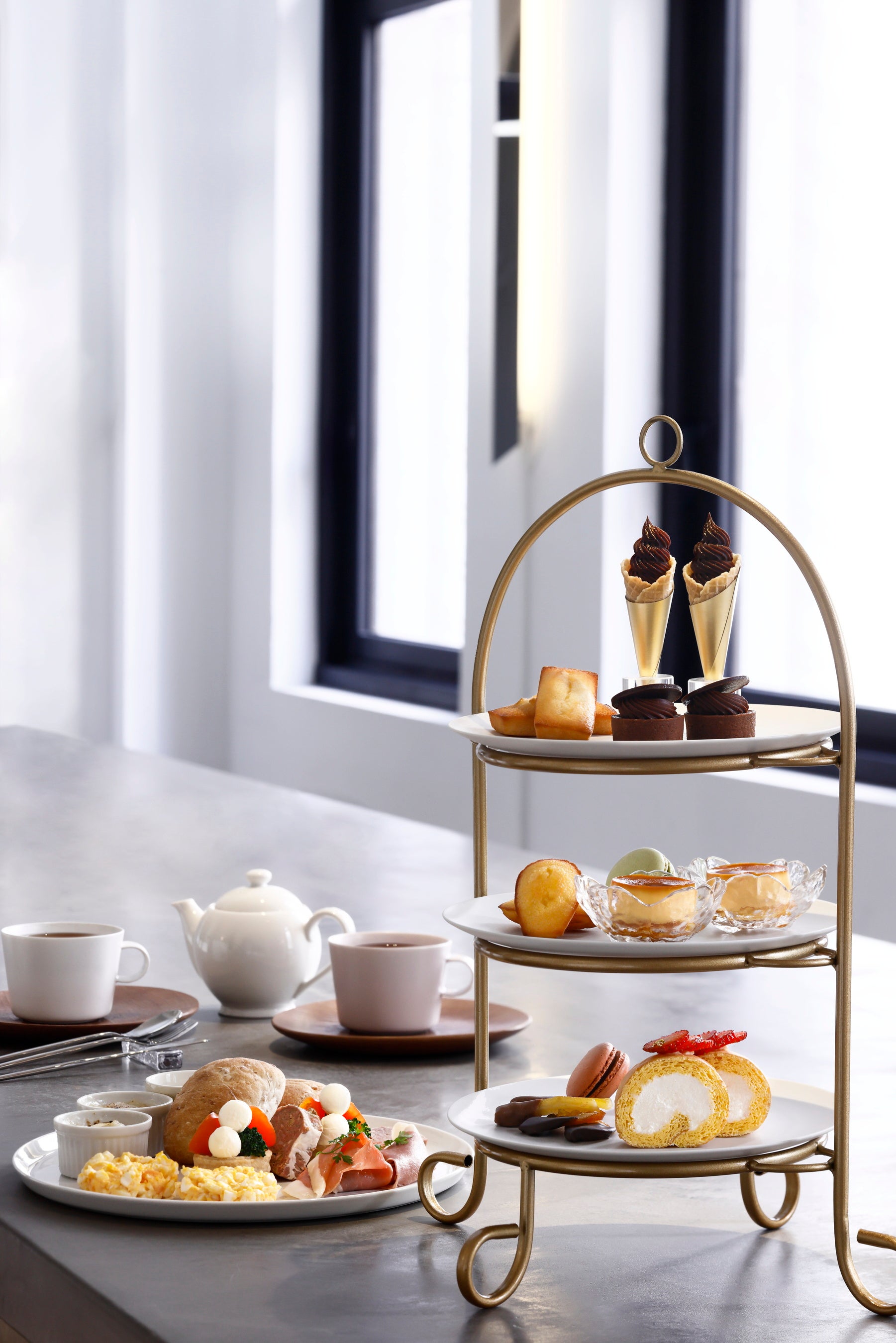 フィナンシェやマドレーヌといったフランスの代表的な焼き菓子に加え、ベルギーの文化を反映したショコラ、スイスが発祥とされるロールケーキなど、多彩なデザートをティースタンドに美しく盛り込みました。