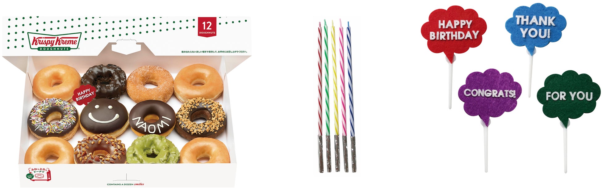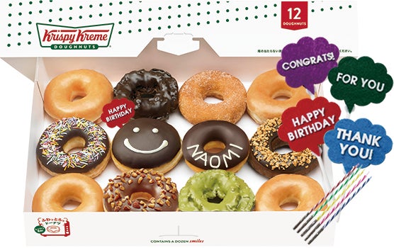 お好きなドーナツ12個のうち1つに最大8文字までの名前やメッセージをデコレーションできる、クイック オーダーだけの限定商品。世界で1つだけの特別なダズンをつくって楽しむことができるので、贈り物やお祝いのシーンにもぴったり。
