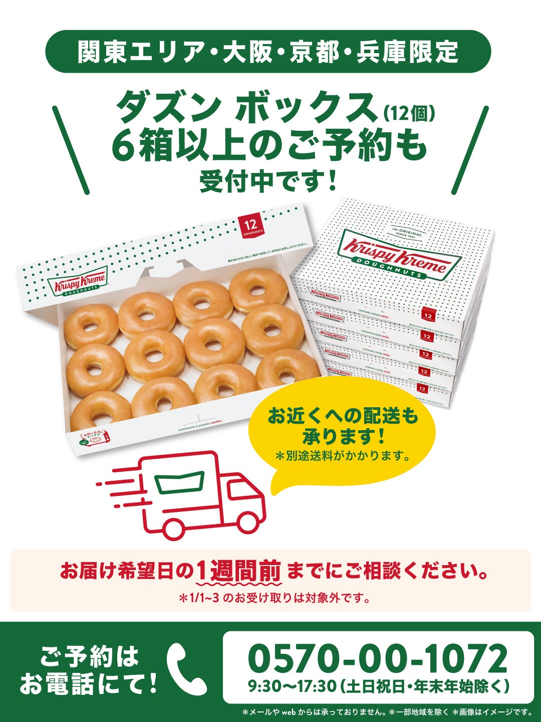 これまでは10ダズン(1ダズン=12個)など大量のご注文をいただいた場合、お受け取りが店舗に限られていましたが、本サービスの開始により、お客様ご指定の場所までお届けすることが可能になり、職場でのパーティーやイベントなど、“たくさんの人とシェアするシーン”に、クリスピー・クリーム・ドーナツを手軽にお楽しみいただくことができるようになりました。ご予約はお届け希望日の1週間前までにお電話にて承ります。