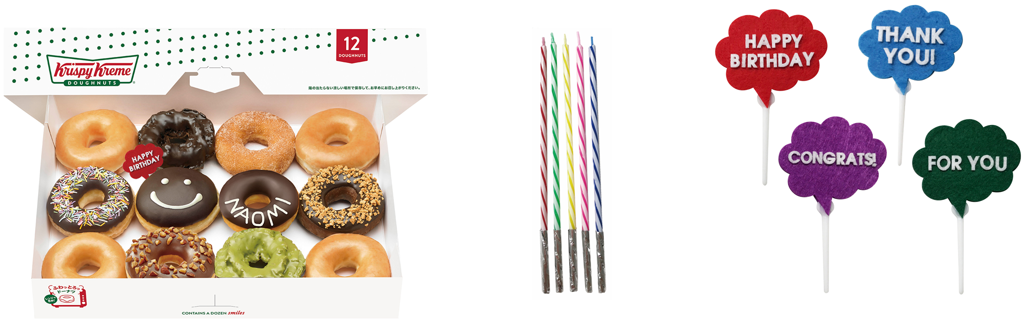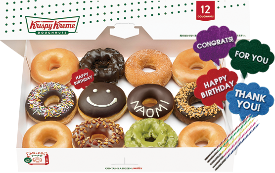 お好きなドーナツ12個のうち1つに最大8文字までの名前やメッセージをデコレーションできる、クイック オーダーだけの限定商品。世界で1つだけの特別なダズンをつくって楽しむことができるので、贈り物やお祝いのシーンにもぴったり。