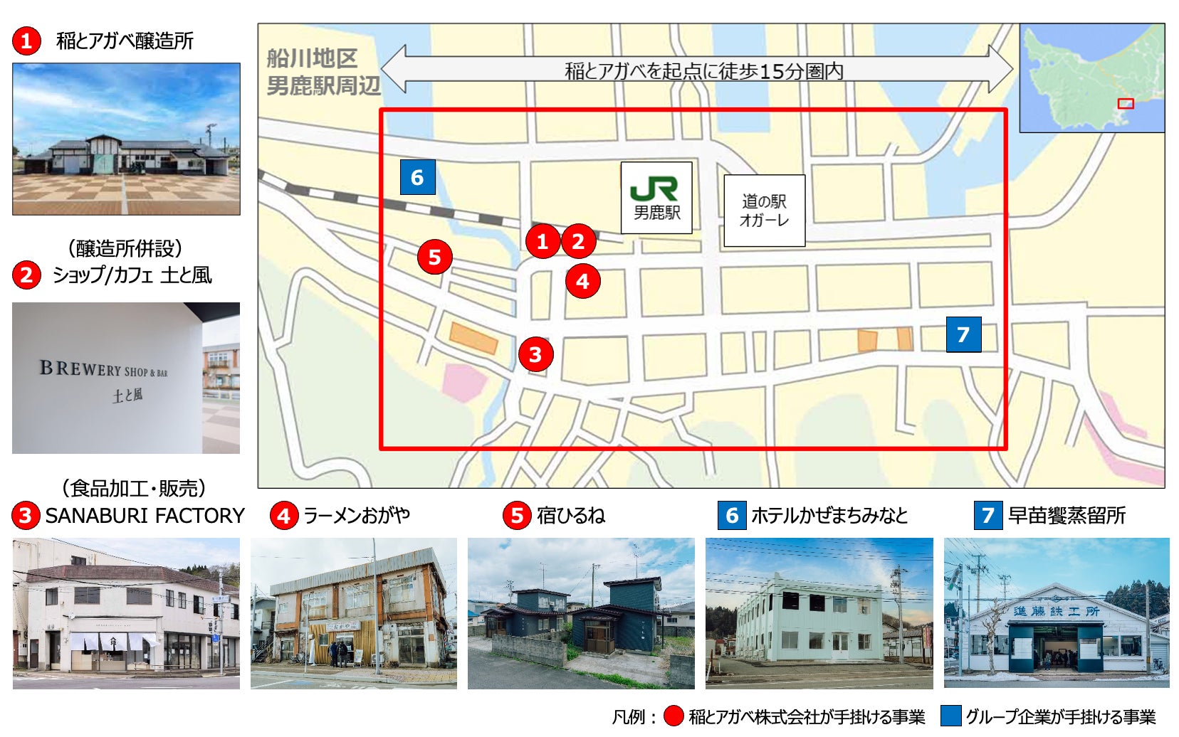 稲とアガベは、秋田県男鹿市で2021年の秋に創業したクラフトサケ醸造所です。「クラフトサケ」とは、日本酒の製造技術をベースとして、そこに副原料を入れることで新しい味わいを目指した新ジャンルのお酒です。私たちは、単にお酒を造るだけでなく、お酒を「地域メディア」として位置付けています。お酒を通じて男鹿に興味を持っていただき、実際に訪れて楽しんでもらうことを目指し、醸造所を起点とした街づくりを推進してまいりました。創業から数年で、レストラン、食品加工所、ラーメン店に加え、サウナ付きホテル「ホテルかぜまちみなと」「ひるね」、スピリッツを製造する「早苗饗蒸留所」、そして人々が集うスナック「シーガール」を開業いたしました。クラフトサケを起点に男鹿の街を未来に残すことを目指して活動しています。