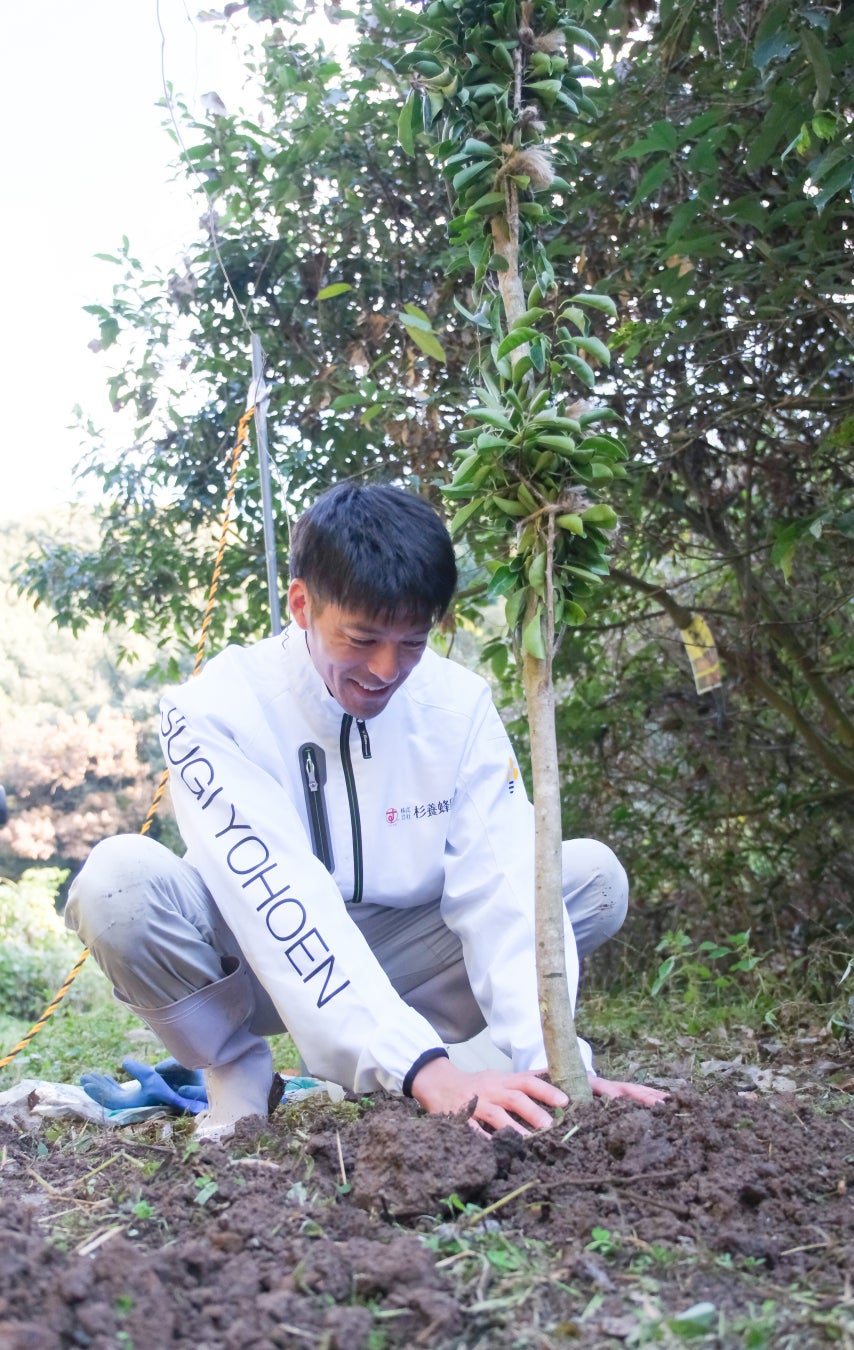当社では、ミツバチの健やかな生育環境を守るため、蜜源植物の植樹活動を継続的に実施しています。2026年1月にはヤマハゼ、サカキ、ソヨゴ、ヒメシャラ、リョウブ、エゴノキの6種類・計60本を植樹しました。これらはミツバチの重要な蜜源であると同時に、地域の生態系を支える樹種でもあります。また当社は、2023年に北海道厚岸郡浜中町と「みつばちの森づくり基本協定」を締結しました。同町は当社の移動養蜂の拠点であり、毎年採蜜を行っている地域です。2025年6月には、蜜源となるシナノキ200本、エンジュ100本、計300本を植樹しました。こうした取り組みは毎年継続して行っています。