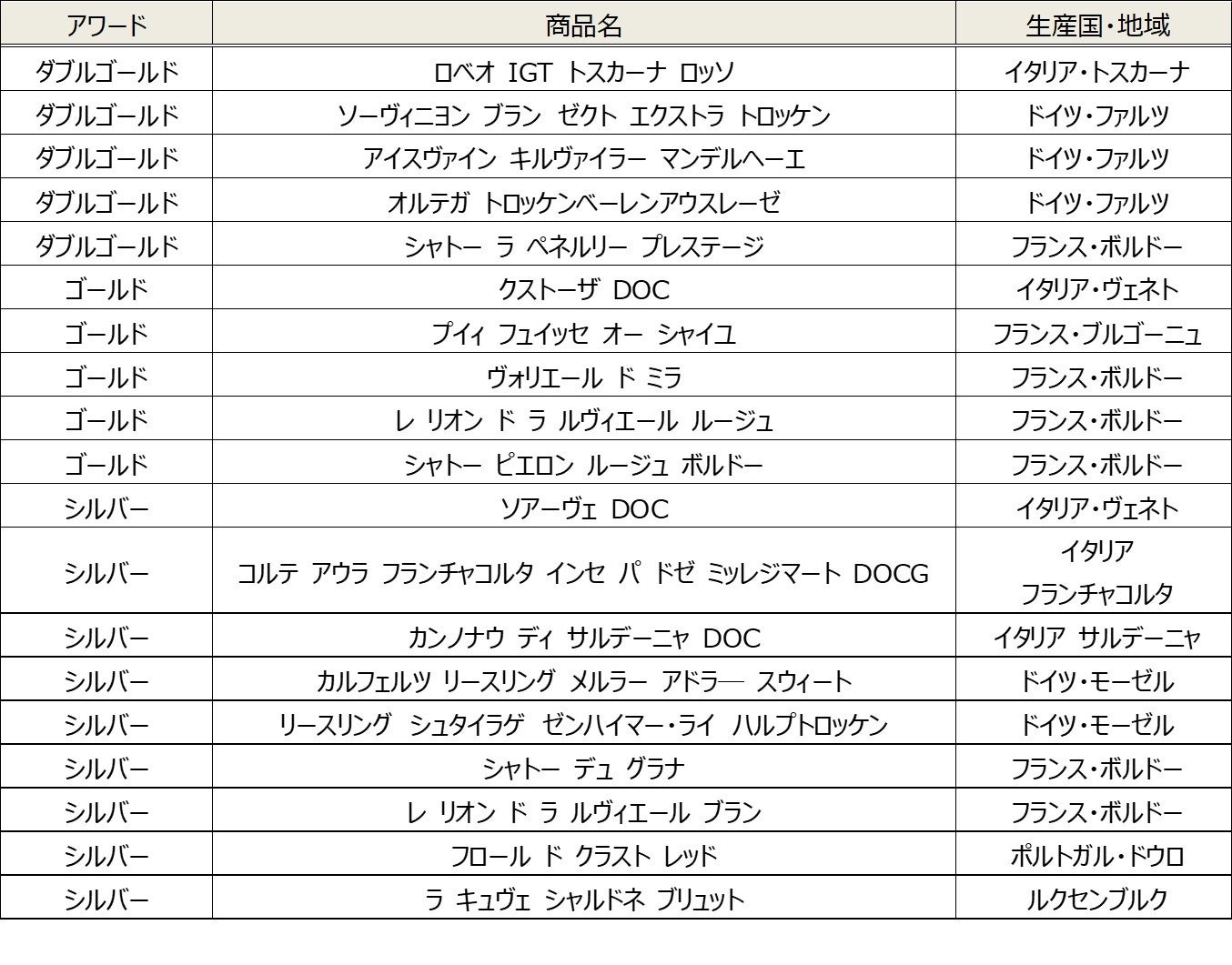 「ロベオ IGT トスカーナ ロッソ」と「シャトー ラ ペネルリー プレステージ」を含む5本がダブルゴールドを受賞。ダブルゴールドは審査員による平均点が93~100点(100点満点で評価)のワインに与えられる賞で、受賞数は全体の約6%です。そのほか、5本がゴールド、9本がシルバーを獲得し、リンベルとしては過去最多の19本が賞をいただくことができました。